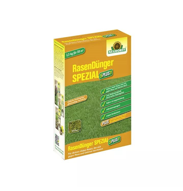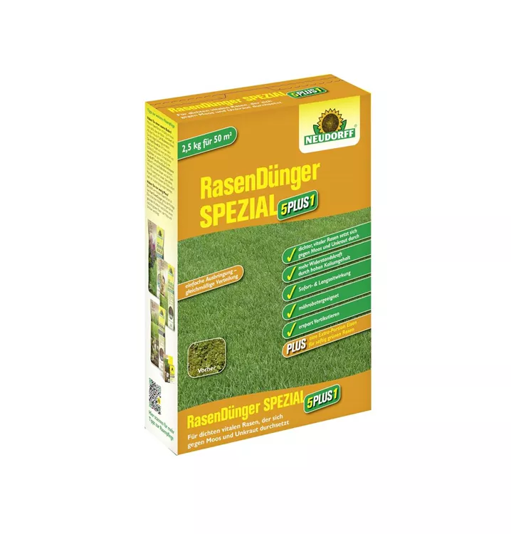 Organisch-mineralischer NPK-Dünger 8-4,5-13 mit innovativer 5PLUS 1 Formel. Für dichten und vitalen Rasen, der Moos und Unkraut verdrängt. Enthält eine Extra-Portion Eisen für saftiges Grün. Der hohe Kaliumgehalt sorgt für mehr Widerstandskraft gegen Trockenheit, Kälte und Krankheiten. Mit Sofort-& Langzeitwirkung. Ein Vertikutieren ist nicht mehr notwendig, der Dünger ist gut für Mulchmäher und Mähroboter geeignet.