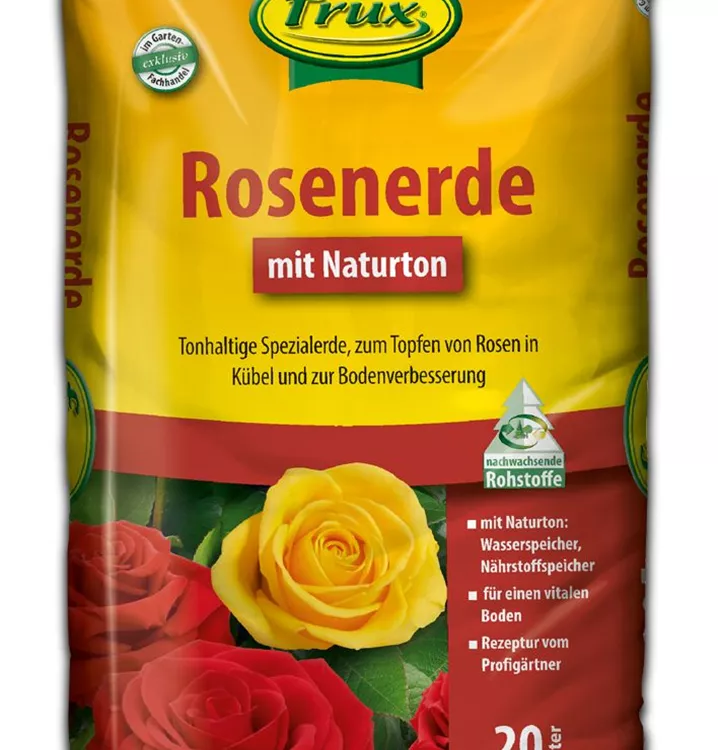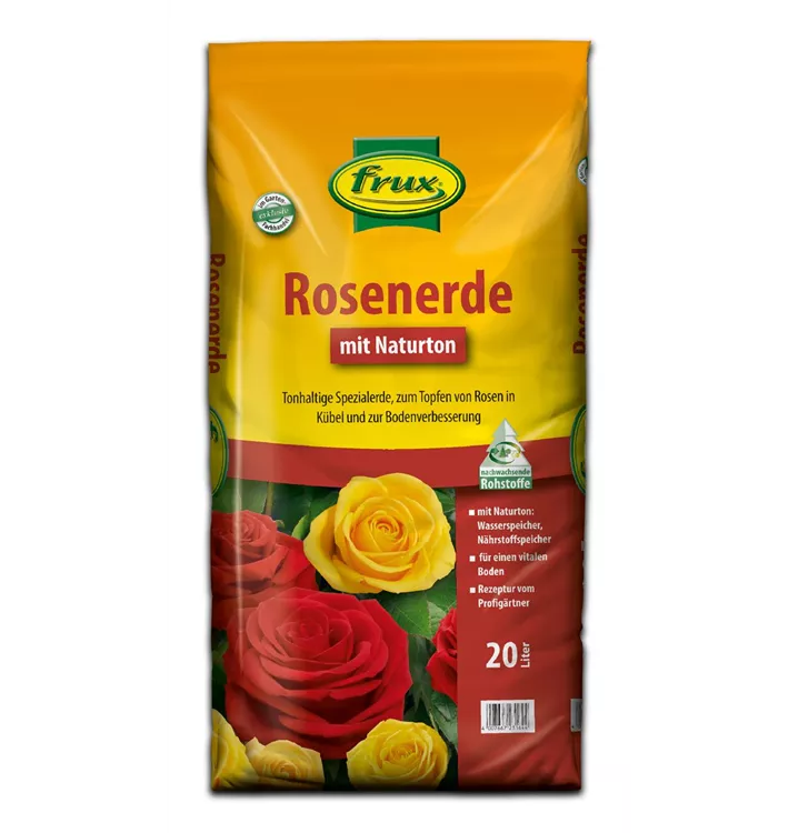 Frux Rosenerde – die Pflanzerde für Rosen mit hohem Anteil an frischem Naturton und Struktur bildendem Rindenhumus. Besonders gut zum Pflanzen von wurzelnakten Rosen im Garten oder auch in Kübel geeignet. Mit allen erforderlichen Nährstoffen. Fördert das Anwachsen, die Weiterentwicklung und den Blütenansatz der Rosen.