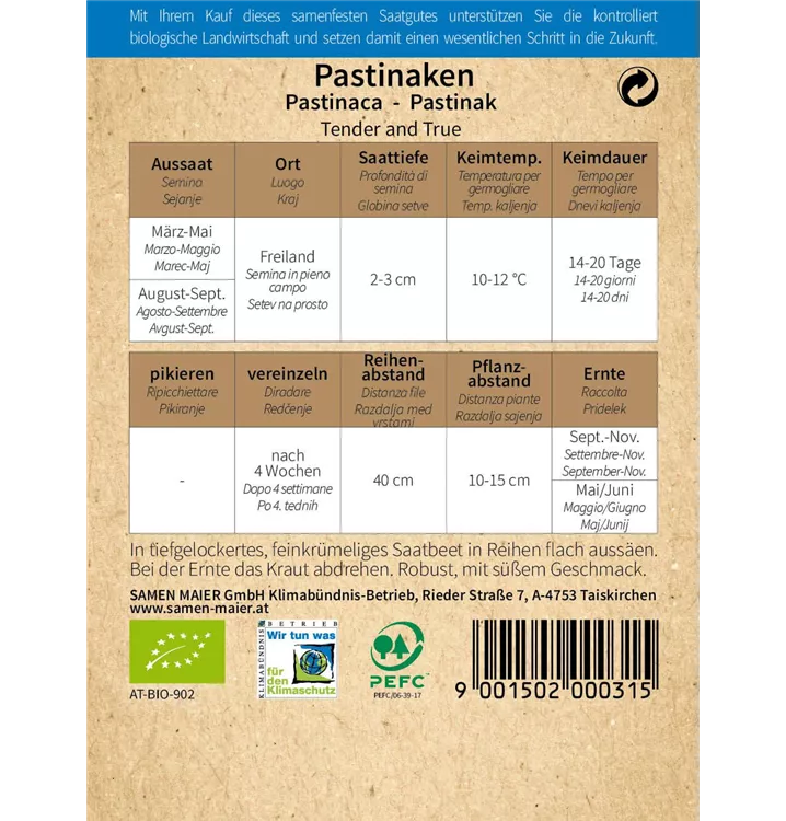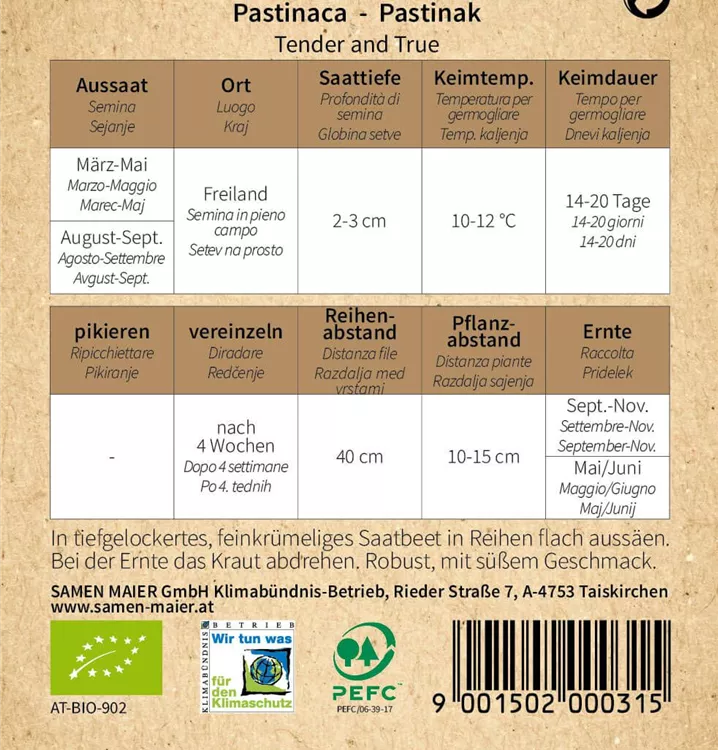 In tiefgelockertes, feinkrümeliges Saatbeet in Reihen flach aussäen. Bei der Ernte das Kraut abdrehen. Robust, mit süßem Geschmack.