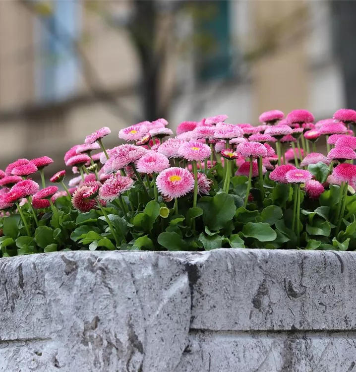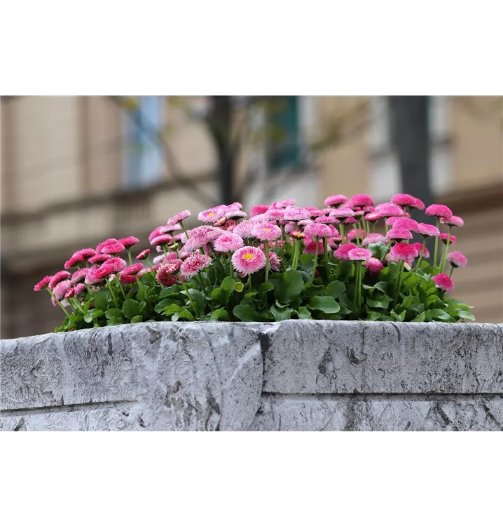 Das Gänseblümchen (Bellis perennis) ist eine rosettenartige Staude, die von Februar bis November rosafarbene, rote oder weiße Blüten bildet. An einem sonnigen bis halbschattigen Standort mit durchlässigem, nährstoffreichem Boden erreicht es gewöhnlich eine Höhe von ca. 20 cm und wird ca. 20 cm breit. Das Gänseblümchen ist gut frostverträglich.