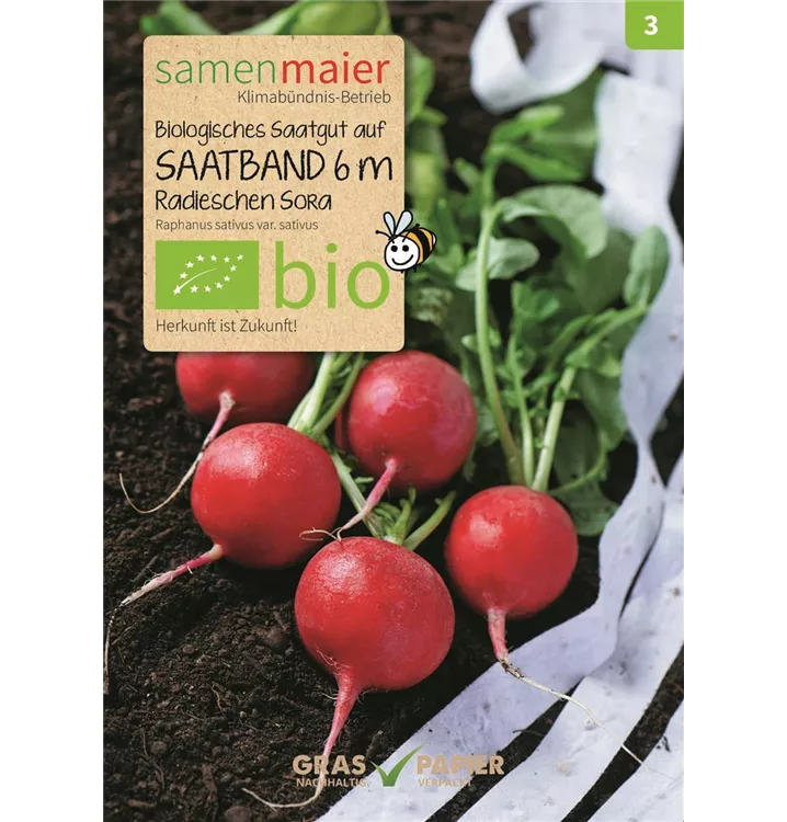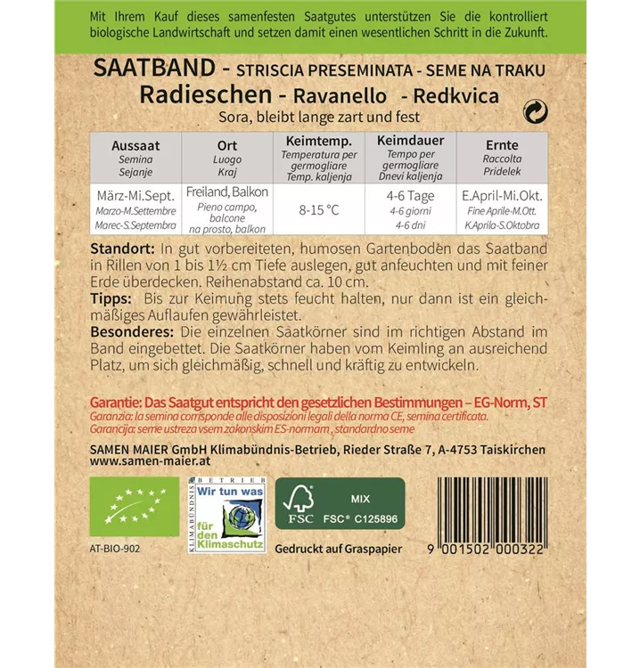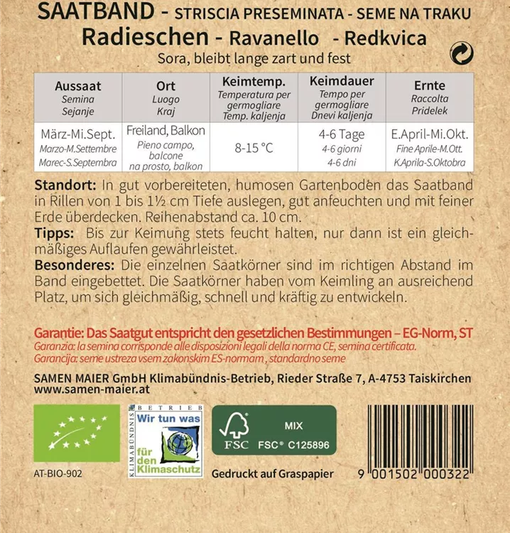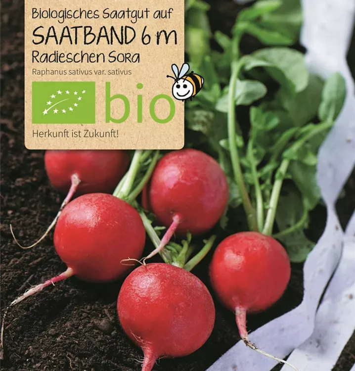Die einzelnen Saatkörner sind im richtigen Abstand im Band eingebettet. Die Saatkörner haben vom Keimling an ausreichend Platz, um sich gleichmäßig, schnell und kräftig zu entwicklen. Besonders beliebtes, anspruchsloses Gemüse mit angenehm würzigem Geschmack. Kurze Kulturzeit. Passt ideal aufs Brot und in gemischte Salate. Radieschen nicht in Folge mit sich selbst, mit Rettich oder mit Kohl anbauen, damit sich keine typischen Krankheiten oder Schädlinge im Boden festsetzen. Erst nach 3-4 Jahren wieder auf derselben Fläche anbauen. Sie gedeihen in beinahe jedem Boden. Radieschen brauchen eine gleichmäßige Wasserversorgung, da sie sonst pelzig oder scharf werden.