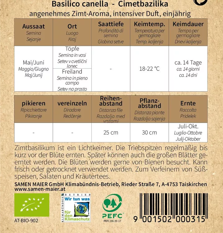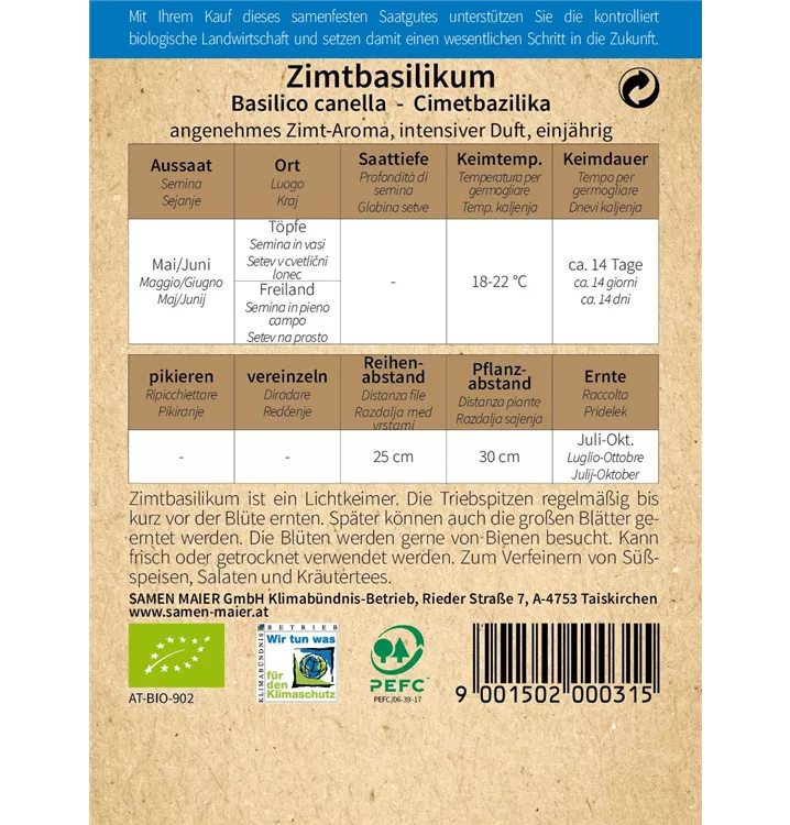 Zimtbasilikum ist ein Lichtkeimer. Die Triebspitzen regelmäßig bis kurz vor der Blüte ernten. Später können auch die großen Blätter geerntet werden. Die Blüten werden gerne von Bienen besucht. Kann frisch oder getrocknet verwendet werden. Zum Verfeinern von Süßspeisen, Salaten und Kräutertees.