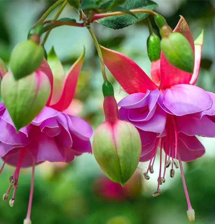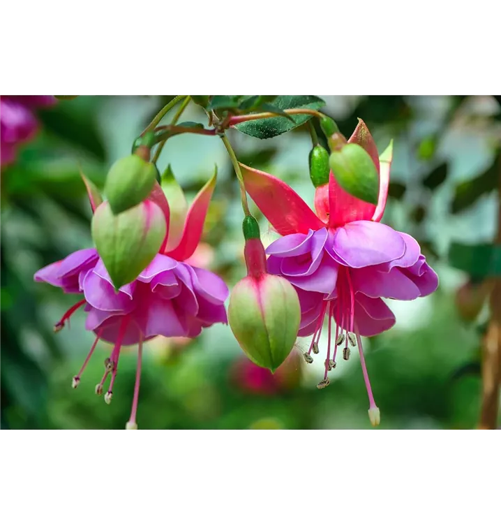 Die Fuchsie (Fuchsia) ist eine sehr beliebte, sommergrüne Kübelpflanze. Ihre dekorativen Blüten sind glockenförmig und erscheinen von Juni bis September. Der Standort sollte möglichst sonnig bis halbschattig und geschützt sein. Eine durchlässige und humose Erde ist dabei ideal.