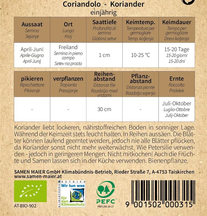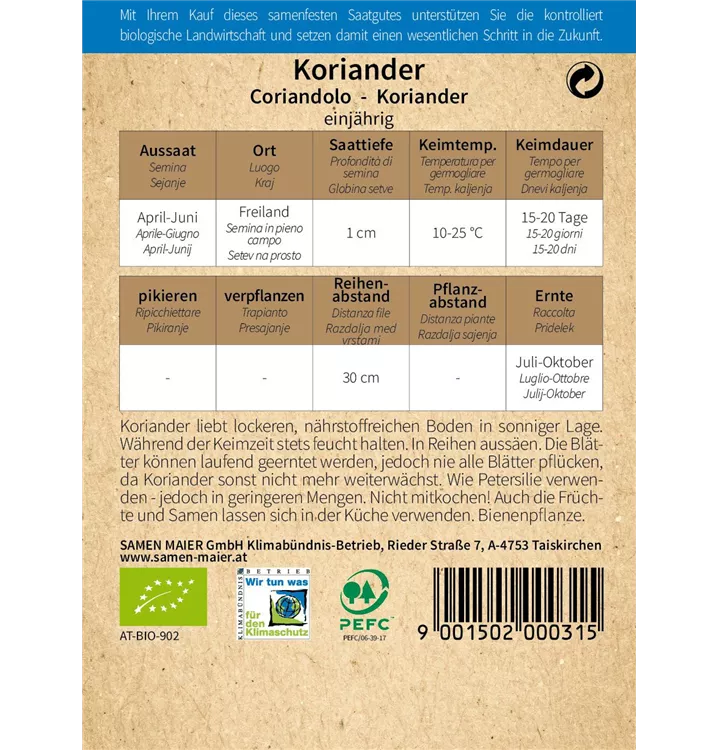 Koriander liebt lockeren, nährstoffreichen Boden in sonniger Lage. Während der Keimzeit stets feucht halten. In Reihen aussäen. Die Blätter können laufend geerntet werden, jedoch nie alle Blätter pflücken, da Koriander sonst nicht mehr weiterwächst. Wie Petersilie verwenden - jedoch in geringeren Mengen. Nicht mitkochen! Auch die Früchte und Samen lassen sich in der Küche verwenden. Bienenpflanze.
