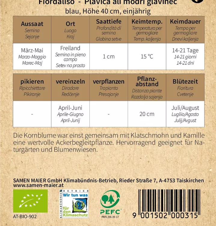 Die Kornblume war einst gemeinsam mit Klatschmohn und Kamille eine wertvolle Ackerbegleitpflanze. Hervorragend geeignet für Naturgärten und Blumenwiesen.