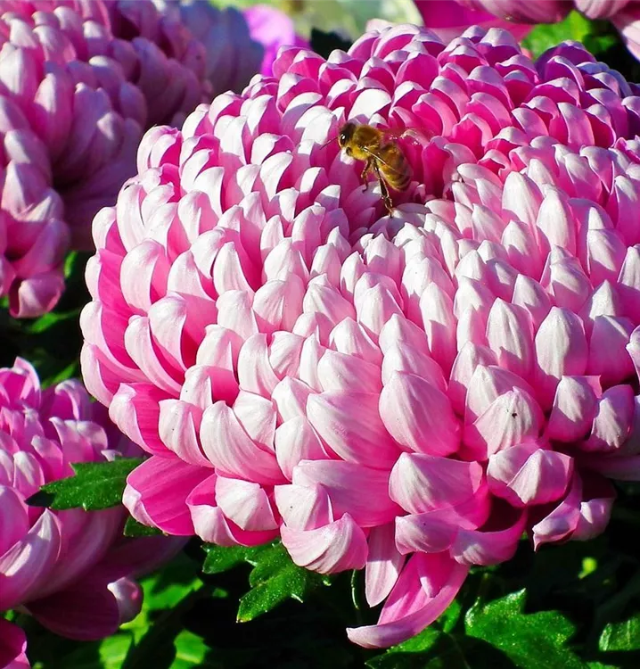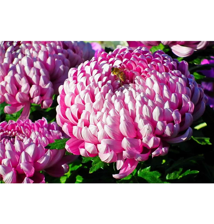 Die Chrysantheme (Chrysanthemum indicum) ist eine buschige Staude, die von August bis November magentafarbene, körbchenartige Blüten bildet. Ihre gefingerten Blätter sind dunkelgrün. An einem sonnigen, windgeschützten Standort mit durchlässigem Boden erreicht sie gewöhnlich eine Höhe von ca. 80 cm und wird ca. 80 cm breit.