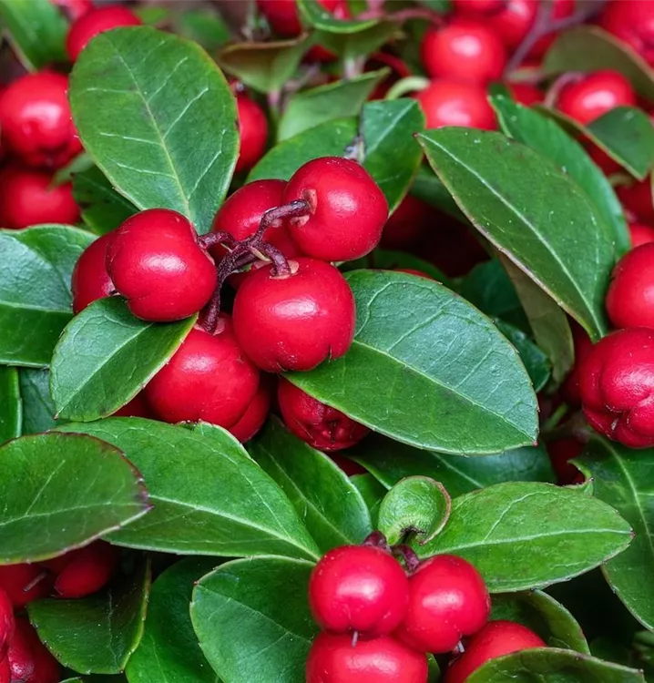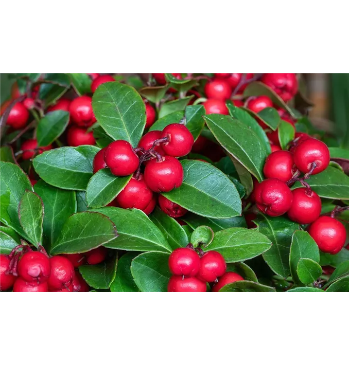 Die Rote Teppichbeere ist ein teppichartiger Zwergstrauch mit dekorativen, roten, runden Früchten, die sehr lange haften. Zudem trägt die Rote Teppichbeere, ledrige, eiförmige, dunkelgrüne Blätter. An einem halbschattigen Standort mit humosem, kalkfreiem, saurem Boden erreicht sie gewöhnlich eine Höhe von ca. 20 cm und wird ca. 40 cm breit.