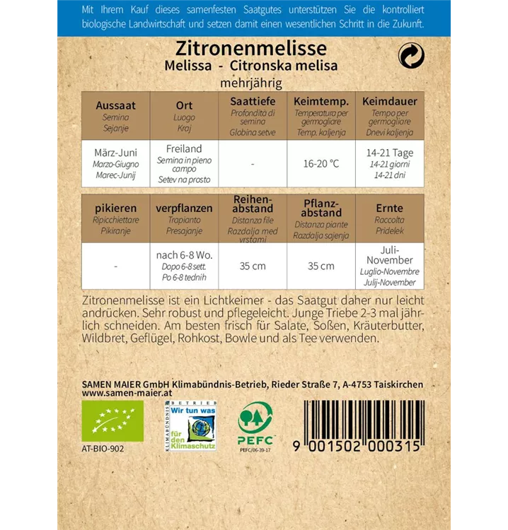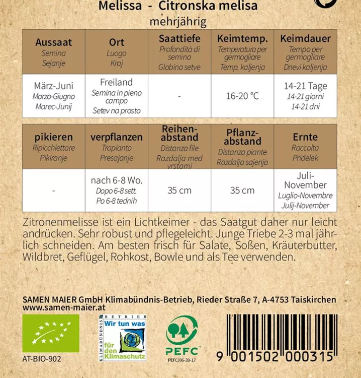 Zitronenmelisse ist ein Lichtkeimer - das Saatgut daher nur leicht andrücken. Sehr robust und pflegeleicht. Junge Triebe 2-3 mal jährlich schneiden. Am besten frisch für Salate, Soßen, Kräuterbutter, Wildbret, Geflügel, Rohkost, Bowle und als Tee verwenden. Hervorragende Bienenweide.