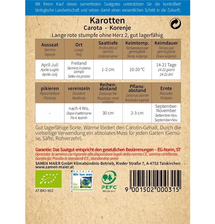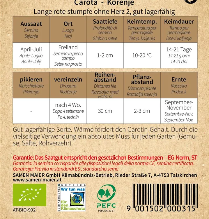 Späte, sehr ertragreiche, aromatische, gut lagerfähige Sorte. Wärme fördert den Carotin-Gehalt. Durch die vielseitige Verwendung ein absolutes Muss für jeden Garten (Gemüse, Säfte, Rohverzehr).