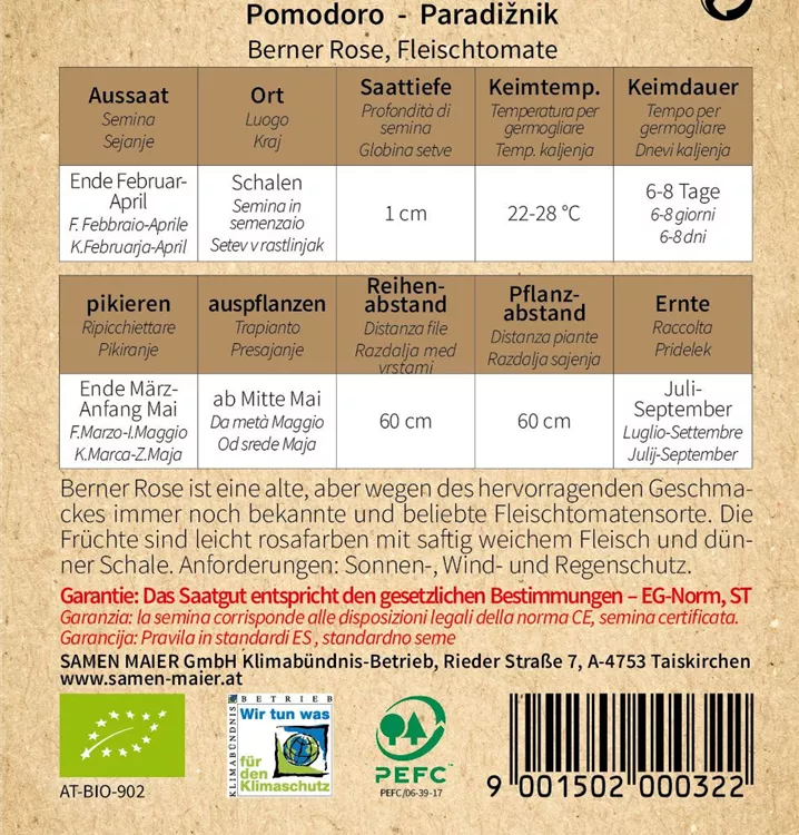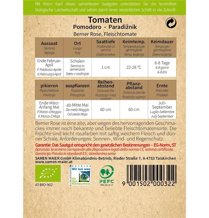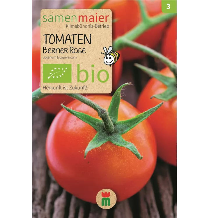 Berner Rose ist eine alte, aber wegen des hervorragenden Geschmackes immer noch bekannte und beliebte Fleischtomatensorte. Die Früchte sind leicht rosafarben mit saftig weichem Fleisch und dünner Schale. Anforderungen: Sonnen-, Wind- und Regenschutz.