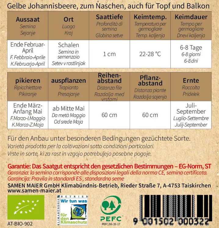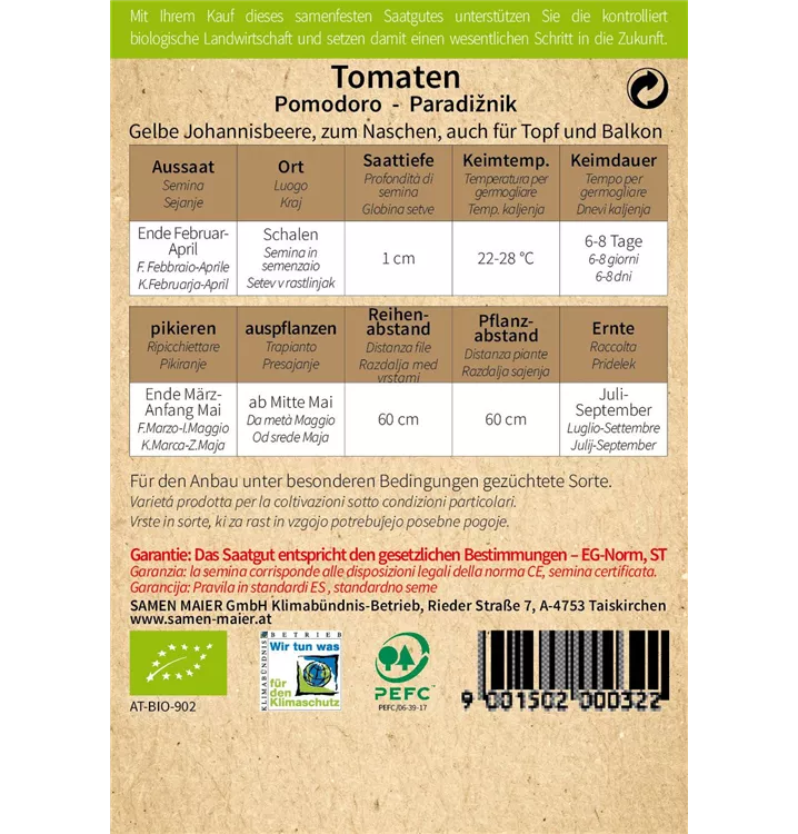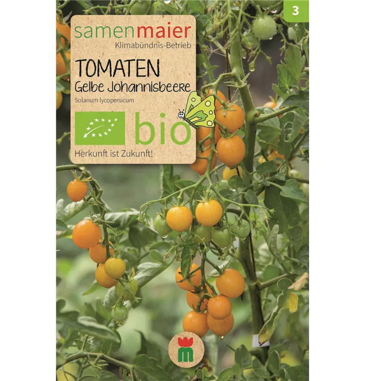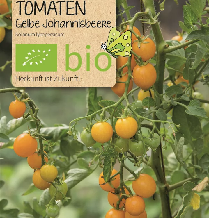Buschig wachsende Tomate, die massenhaft kleine Tomaten an langen Rispen bildet - gelb-orange, süß schmeckende Früchte mit Wildtomatenaroma. Sehr anspruchlose Sorte, die nicht ausgegeizt werden muss. Ideales Naschgemüse auch für Töpfe und Balkon.