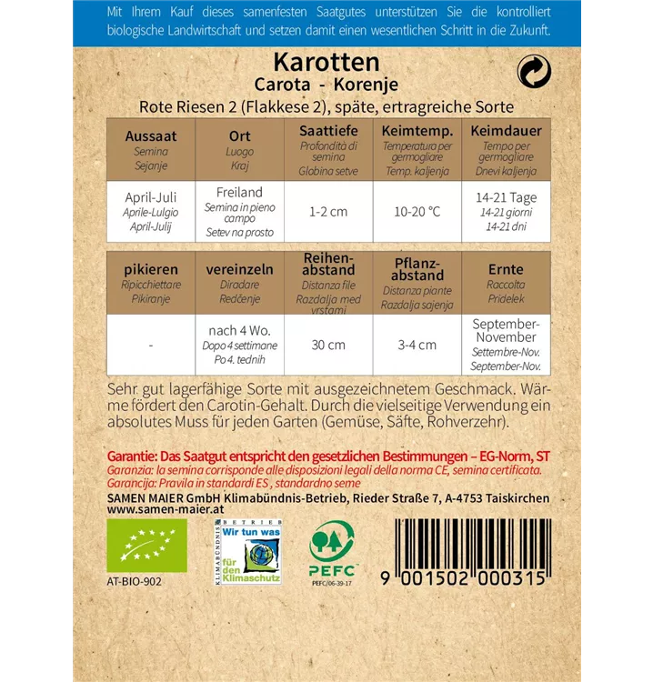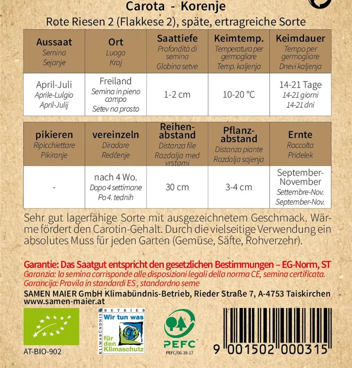 Sehr gut lagerfähige Sorte mit ausgezeichnetem Geschmack. Wärme fördert den Carotin-Gehalt. Durch die vielseitige Verwendung ein absolutes Muss für jeden Garten (Gemüse, Säfte, Rohverzehr).