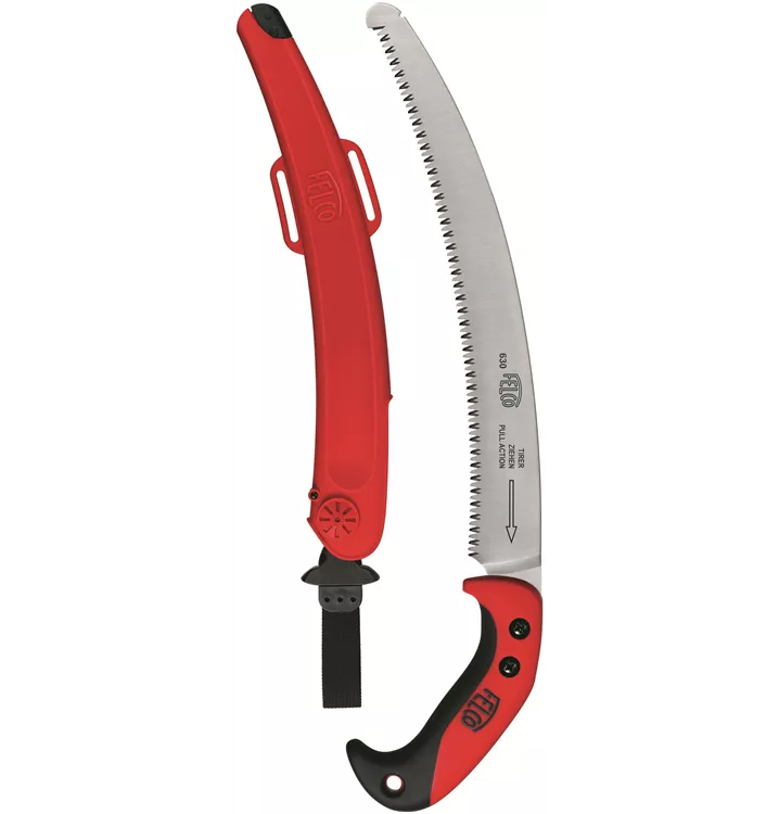 Diese gebogene Säge mit ziehendem Schnitt wurde so konzipiert, dass Sie auch stärkere Äste mit einem Durchmesser bis zu 12 cm unglaublich leicht durchtrennen können. Von der hocheffizienten Spanabfuhr – die das frustrierende Verklemmen der Säge verhindert – bis hin zur unglaublichen Geschwindigkeit des impulsbehandelten langen Sägeblattes werden Sie sich jedes Mal auf die Baumschnittarbeiten freuen. Der gebogene Griff mit der Soft-Touch-Beschichtung sorgt bei jedem Sägezug für Stabilität und vibrationsfreien Komfort. Das mitgelieferte Etui ist mit einem innovativen Verschlusssystem ausgestattet, damit die Säge nicht herausfallen kann, wobei die Säge mit dem dazugehörigen Klettband sicher am Bein befestigt wird. Die FELCO 630 wurde entwickelt, um auch große Äste mit Leichtigkeit und sogar über Kopf zu sägen. Sie werden sich fragen, wie Sie jemals ohne diese Säge arbeiten konnten.