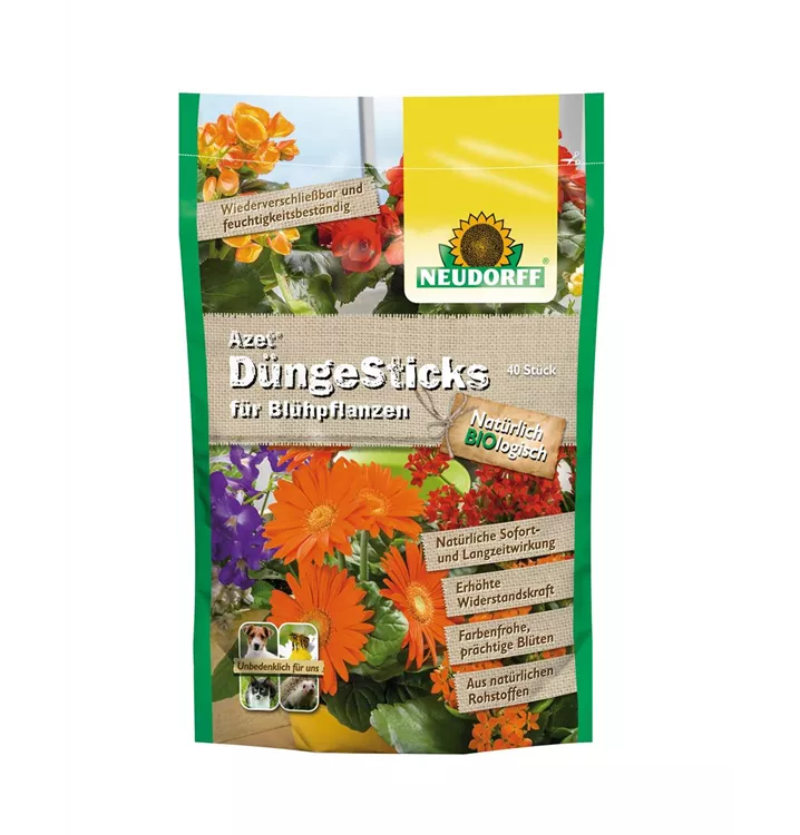 Organischer NPK-Dünger 7-3-6 aus natürlichen Rohstoffen für Blühpflanzen. Mit natürlicher Langzeitwirkung (mind. 100 Tage). Mit bodenbelebenden Mikroorganismen und MyccoVital® (Mykorrhiza) für kräftiges, gesundes Pflanzenwachstum. Einfache Handhabung durch die neue Stick-Form. Der Standbodenbeutel ist wiederverschließbar und feuchtigkeitsbeständig.