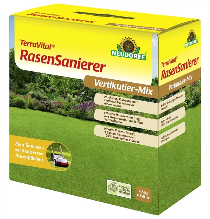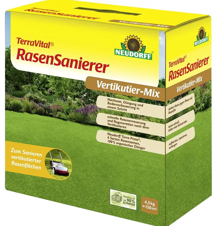Anwendungsfertige Reparaturmischung zur schnellen undnachhaltigen Rasensanierung karger, lückenhafter Flächen nachdem Vertikutieren. Enthält das natürliche und einzigartigeTerraVital® -System. Sorgt für dichten Rasen statt Moos und Filz.Speziell zum großflächigen Ausbessern kahler Stellen geeignet.