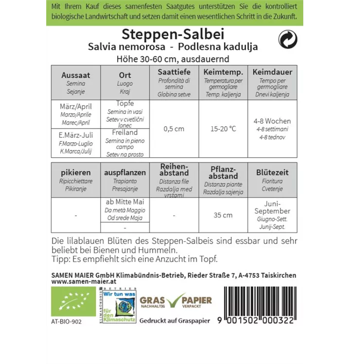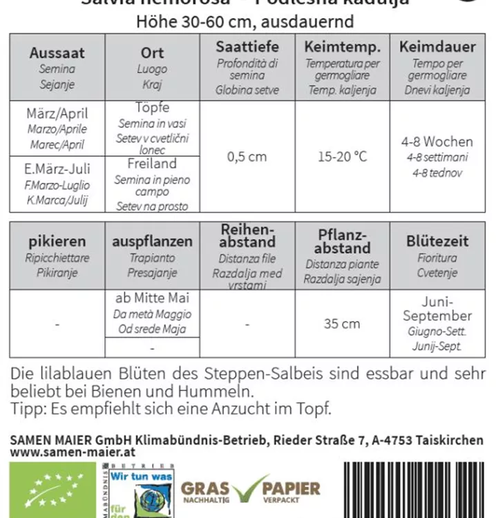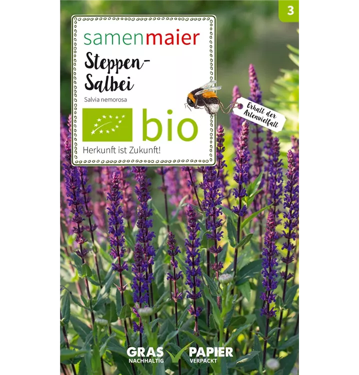 Die lilablauen Blüten des Steppen-Salbeis sind essbar und sehr beliebt bei Bienen und Hummeln. Tipp: Es empfiehlt sich eine Anzucht im Topf.