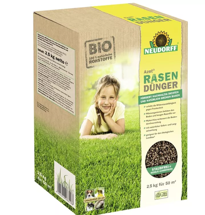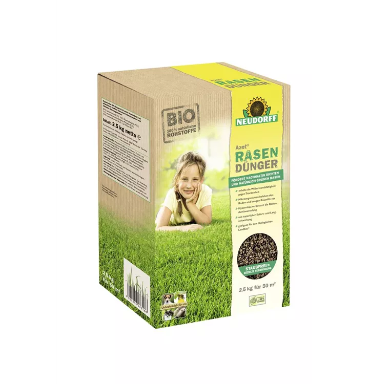 Azet Rasendünger ist ein organischer Volldünger mit nützlichen Bakterien und Mycorrhiza-Pilzen für dichten und sattgrünen Rasen. Die Bodenstruktur und die Nährstoffversorgung werden so nachhaltig verbessert. Für eine optimale Ausbringung per Hand oder Streuwagen sorgt der Dünger in Form eines staubarmen Granulats. Azet Rasendünger ist für Mähroboter geeignet.