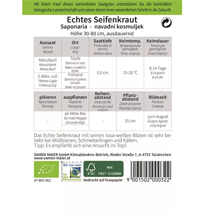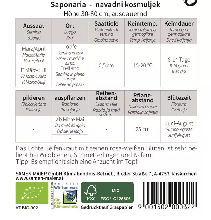Das Echte Seifenkraut mit seinen rosa-weißen Blüten ist sehr beliebt bei Wildbienen, Schmetterlingen und Käfern. Tipp: Es empfiehlt sich eine Anzucht im Topf.