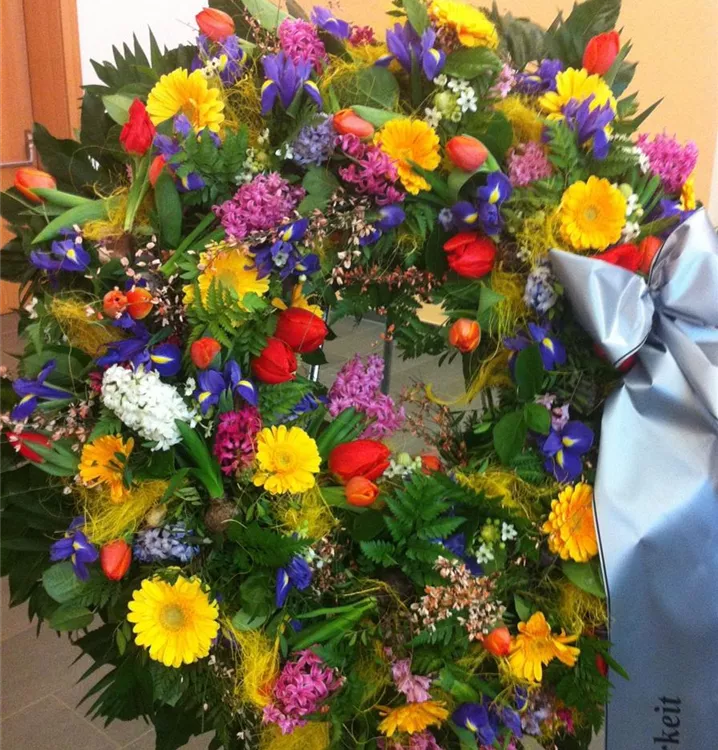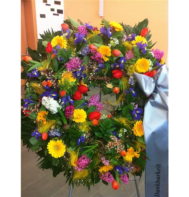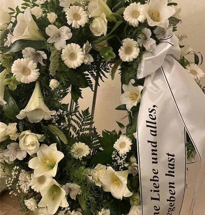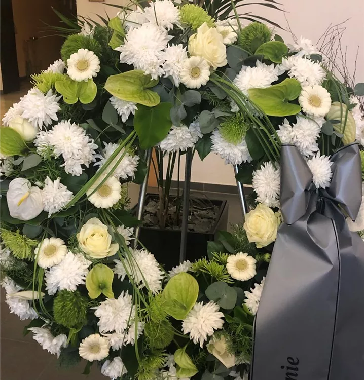 Ein Trauerkranz ist ein formschönes Werkstück aus Schnittblumen mit saisonalem Beiwerk.