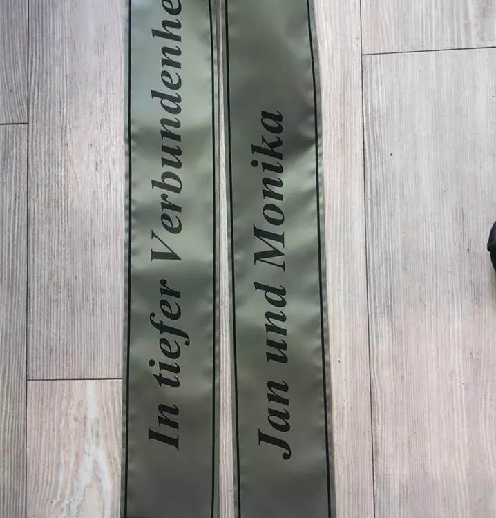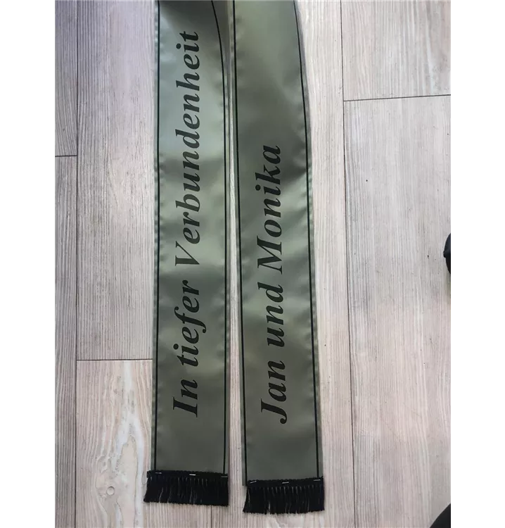 Jeder Schleifenteil hat eine Länge von 80 cm und eine Breite von 10 cm. Der Abschluss ist eine schwarze Trauerborte. Bitte wählen Sie einen würdevollen Trauertext aus.