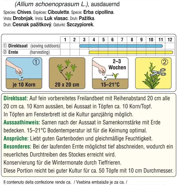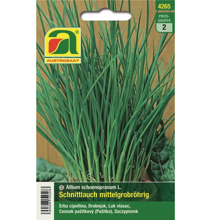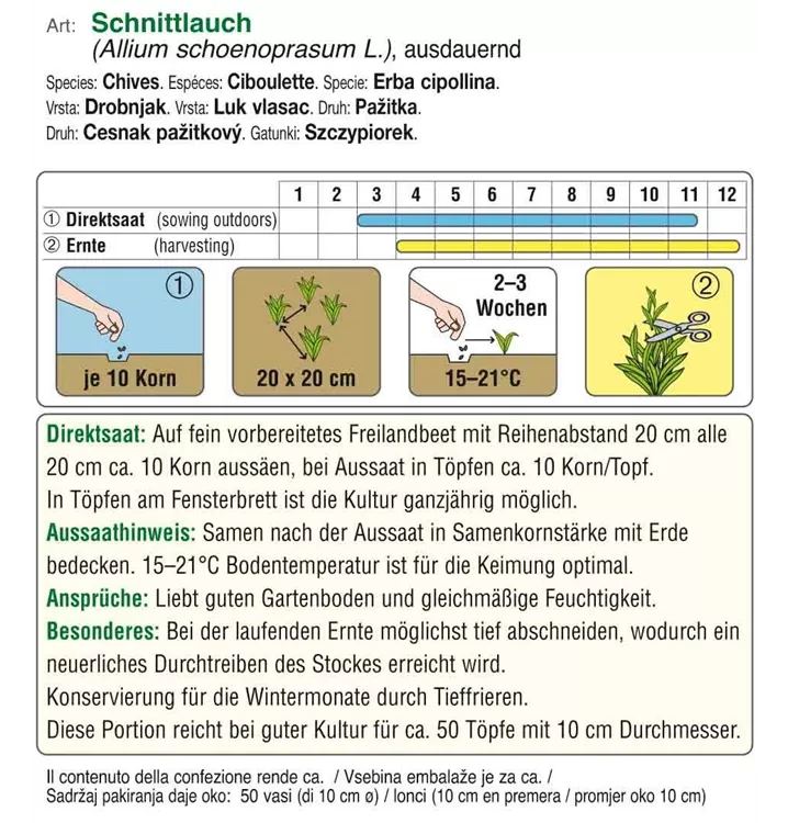 Eine winterharte Sorte mit dunkelgrünen, mittelgroben Schnittlauchhalmen. Schnittauch liebt guten Gartenboden und gleichmäßige Feuchtigkeit.