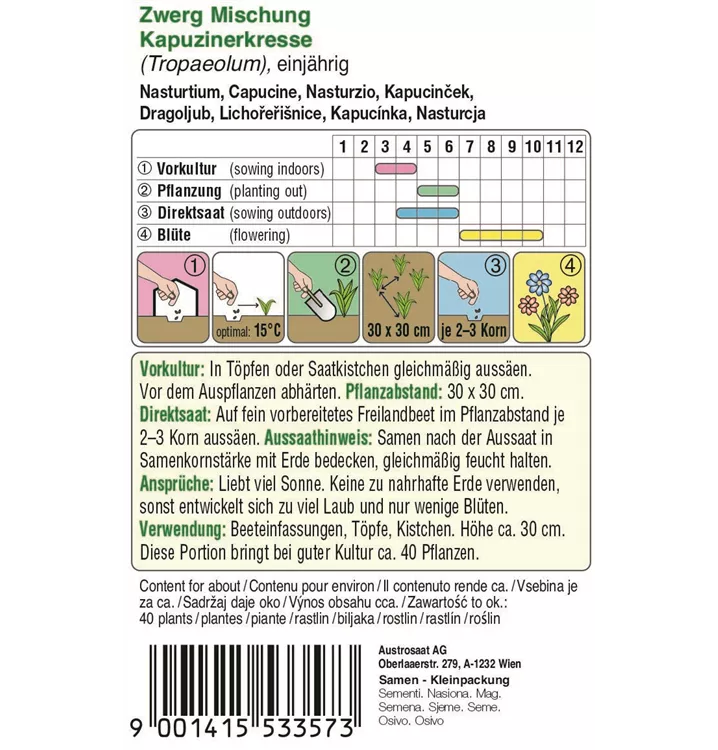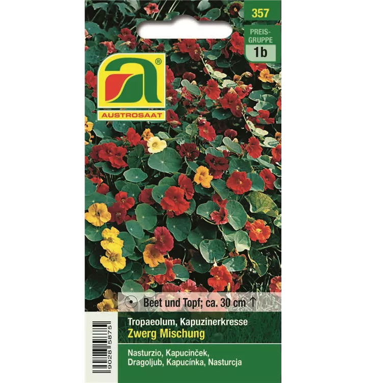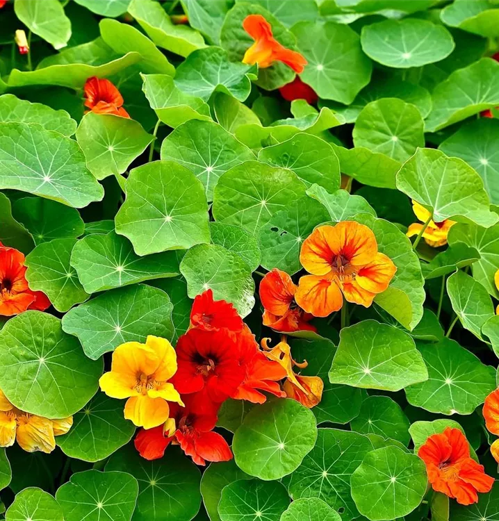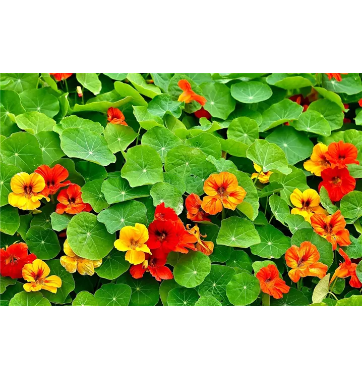 Die Kapuzinerkresse (Tropaeolum) ist eine beliebte Pflanze für den Balkon. Ein sonniger bis halbschattiger Standort und ein durchlässiges Substrat werden bevorzugt