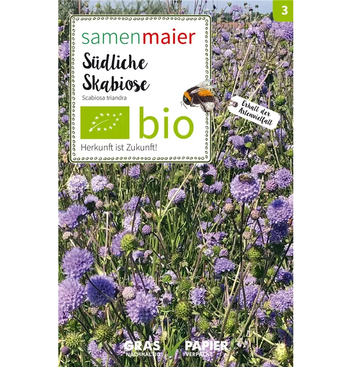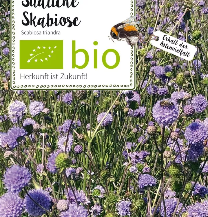 Die purpurlila-blaulila Blüten der Südlichen Skabiose sind essbar und ein wahrer Insektenmagnet! Tipp: Es empfiehlt sich eine Anzucht im Topf.