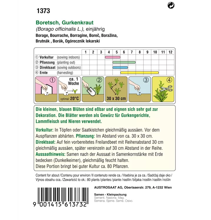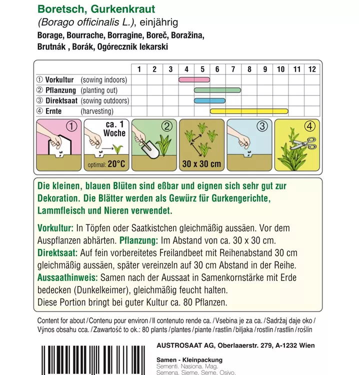 Die kleinen, blauen Blüten sind essbar und eignen sich sehr gut zur Dekoration. Die Blätter werden für Gurkengerichte, Lammfleisch und Nieren verwendet.