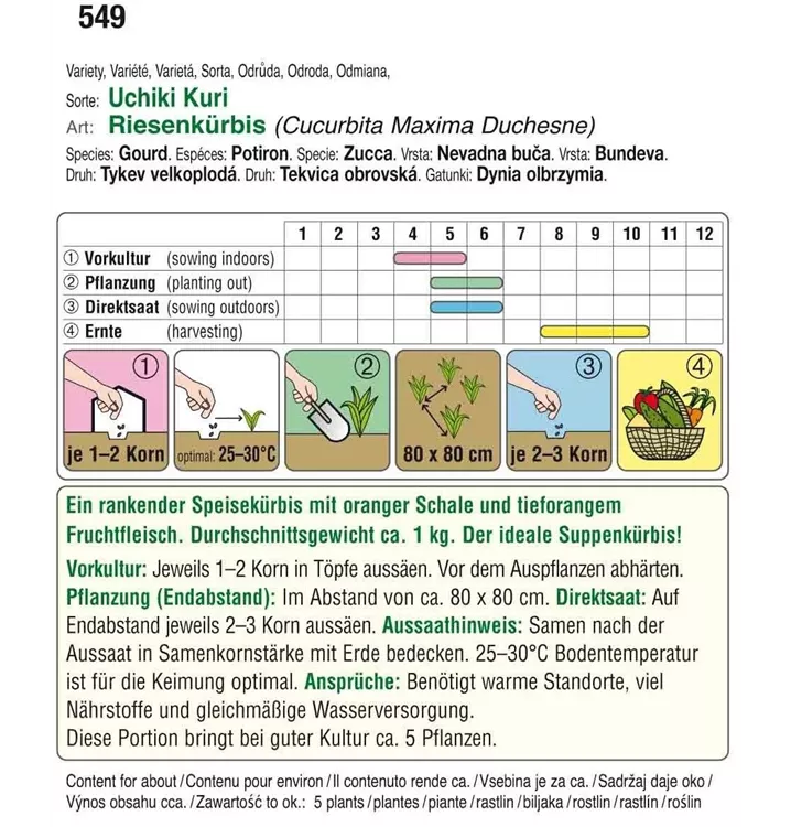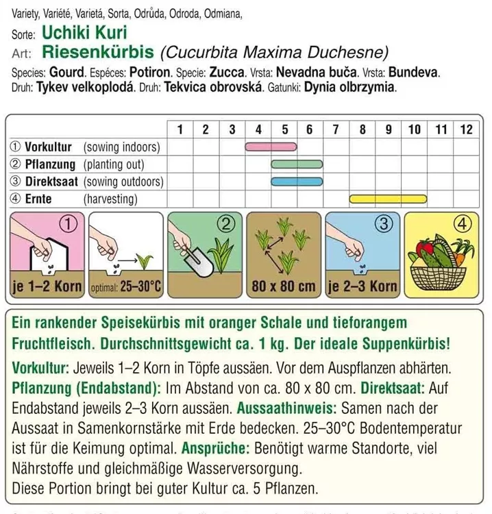 Ein rankender Speisekürbis mit oranger Schale und tieforangem Fruchtfleisch. Durchschnittsgewicht ca. 1 kg. Der ideale Suppenkürbis!