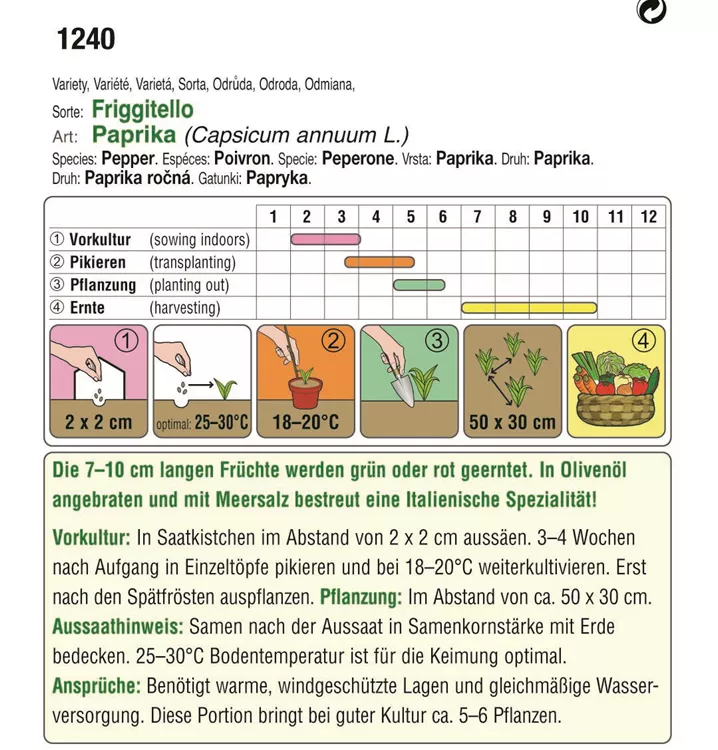 Die 7-10 cm langen Früchte werden grün oder rot geerntet. In Olivenöl angebraten und mit Meersalz bestreut eine Italienische Spezialität!