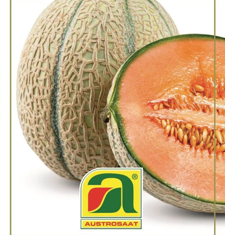 Zuckermelone mit rund-ovalen, gleichmäßigen Früchten mit orangem Fruchtfleisch und genetzter Schale.