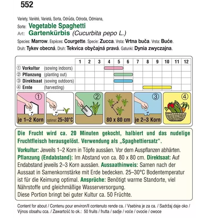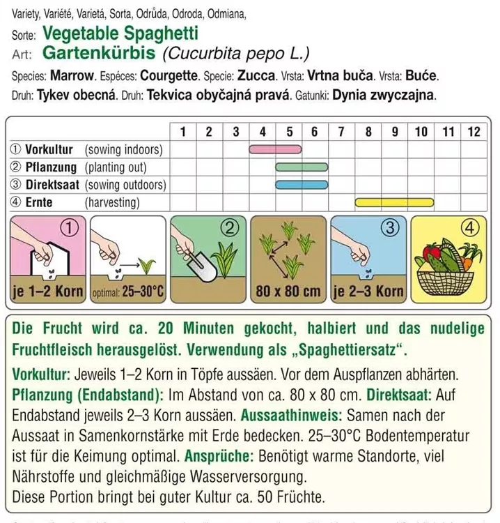 Die Frucht wird ca. 20 Minuten gekocht, halbiert und das nudelige Fruchtfleisch herausgelöst. Verwendung als "Spaghettiersatz".