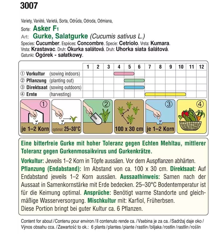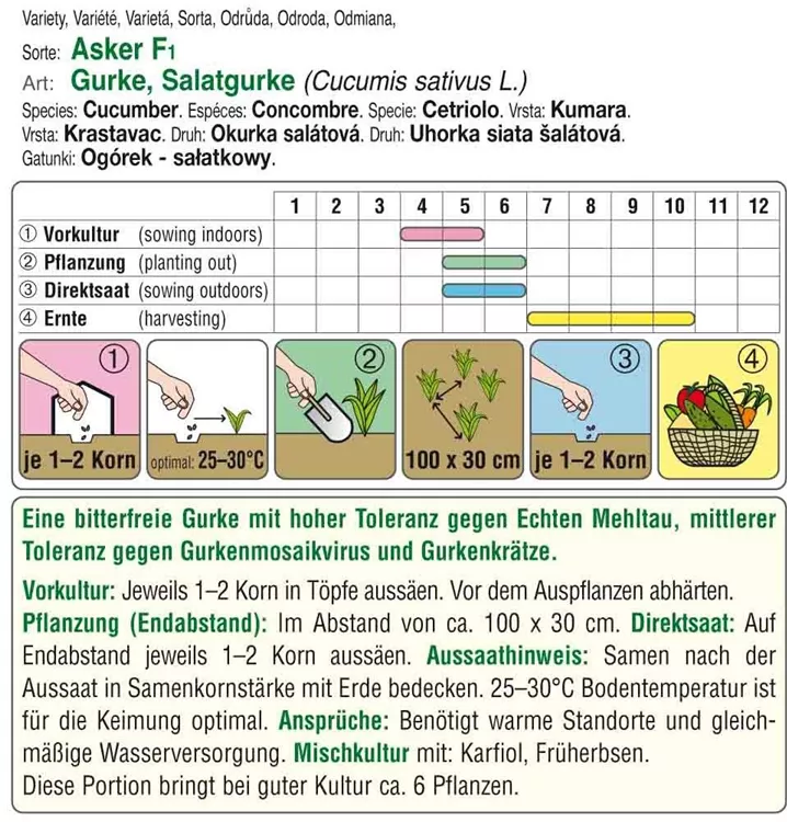 Eine bitterfreie Gurke mit hoher Toleranz gegen Echten Mehltau, mittlerer Toleranz gegen Gurkenmosaikvirus und Gurkenkrätze.
