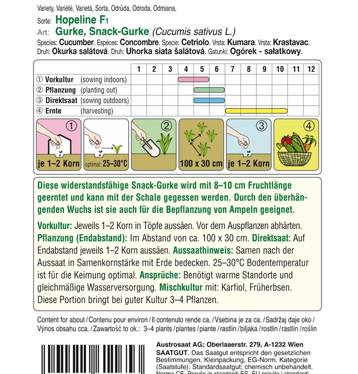 Diese widerstandsfähige Snack-Gurke wird mit 8-10 cm Fruchtlänge geerntet und kann mit der Schale gegessen werden. Durch den überhängenden Wuchs ist sie auch für die Bepflanzung von Ampeln geeignet.