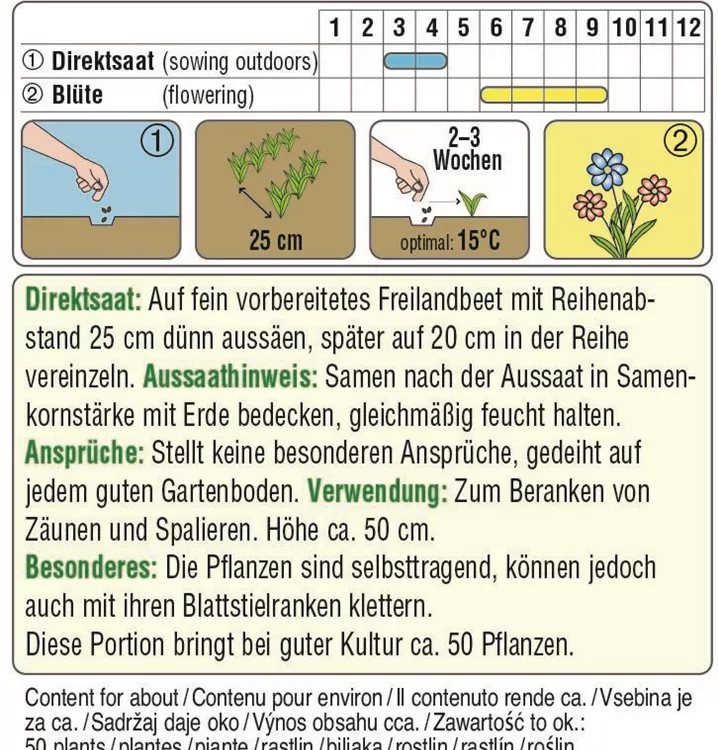 Eine duftende Rankpflanze, die an Spalieren und Zäunen ein Hingucker ist. Die Pflanzen sind selbsttragend, können jedoch auch mit ihren Blattstielranken klettern. Sie werden ca. 50 cm hoch.