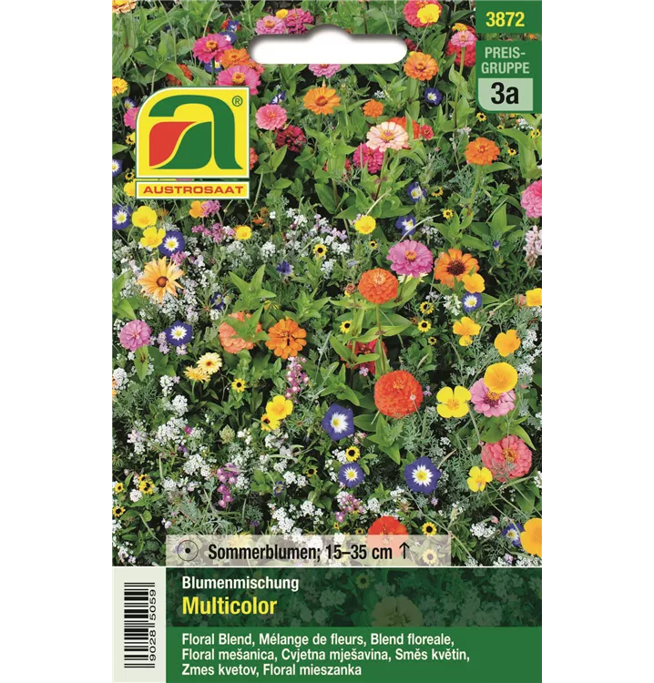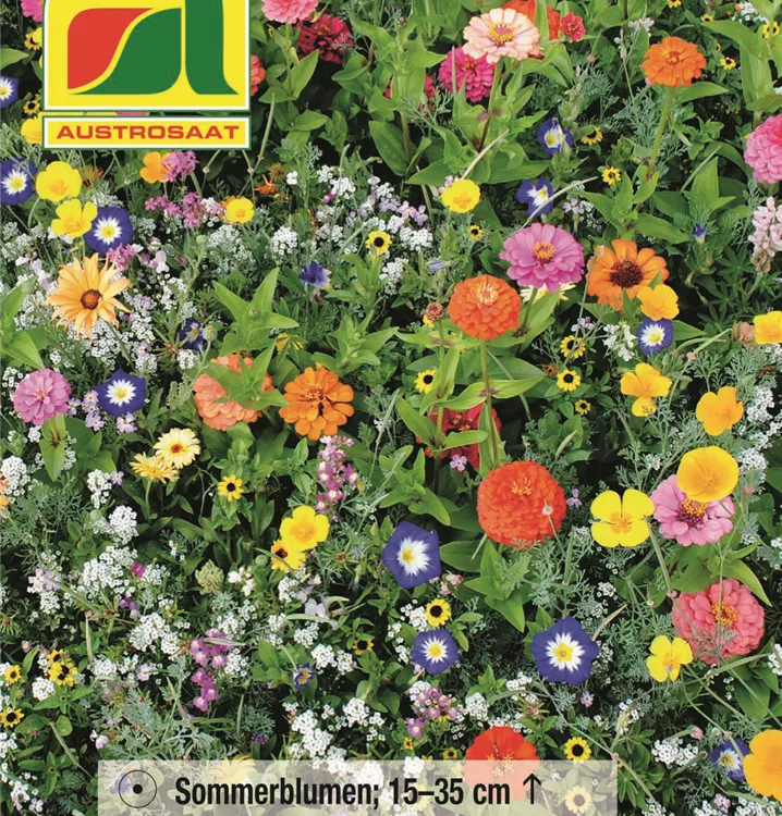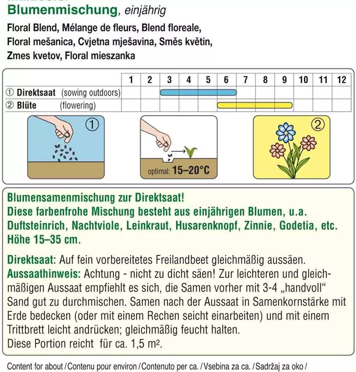 Blumensamenmischung zur Direktsaat! Diese farbenfrohe Mischung besteht aus einjährigen Blumen u.a. Duftsteinrich, Nachtviole, Leinkraut Husarenkopf, Zinnie, Godetia, etc.