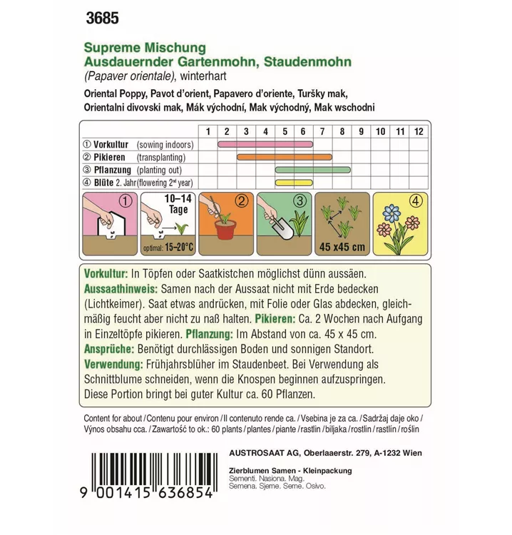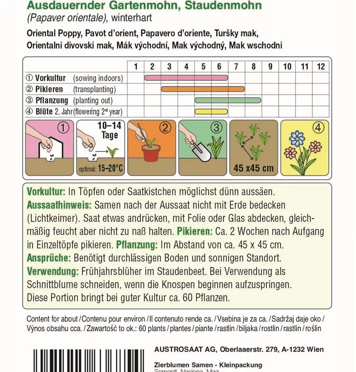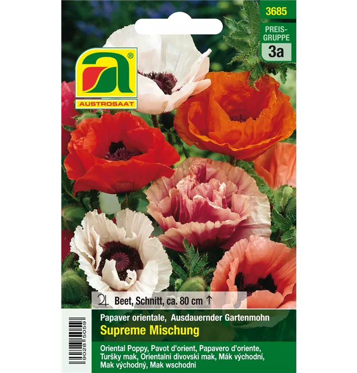 Eine Mischung von Mohn in pastelligen bis roten Farben, die im Frühjahr ab dem 2. Jahr erscheinen. Er benötigt einen durchlässigen Boden und sonnigen Standort.