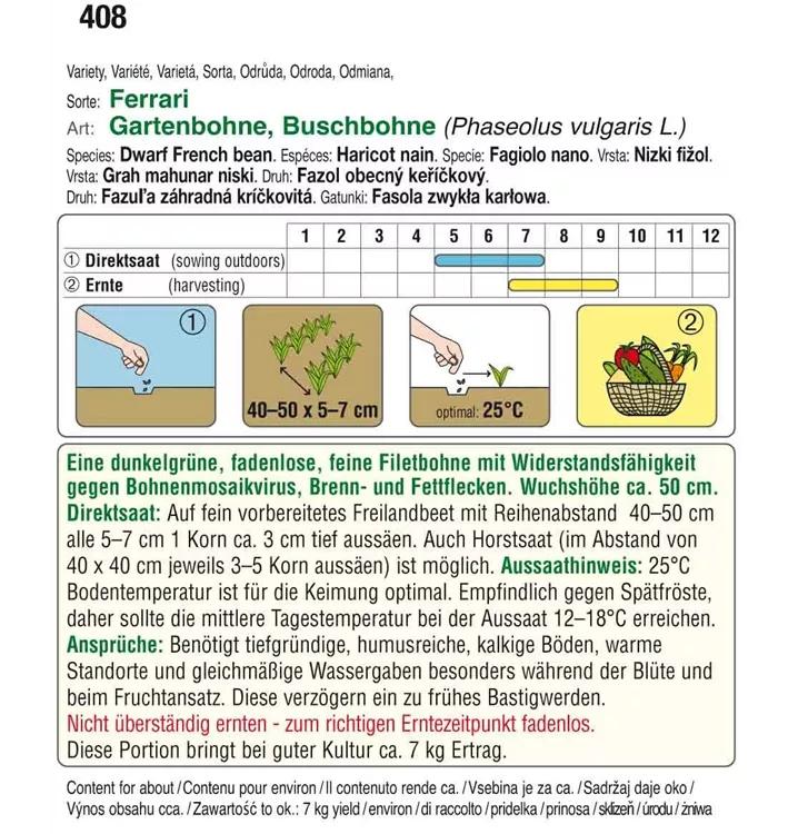 Eine dunkelgrüne, fadenlose, feine Filetbohne mit Widerstandsfähigket gegen Bohnenmosaikvirus, Brenn- und Fettflecken.