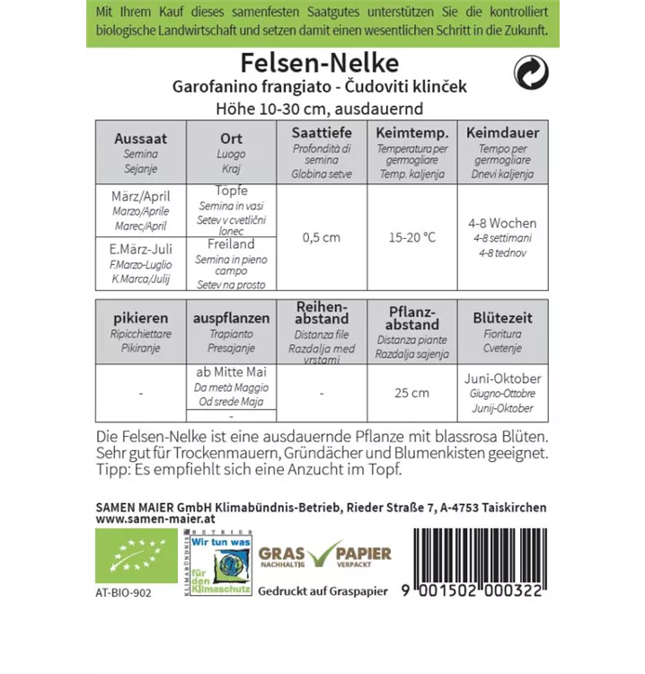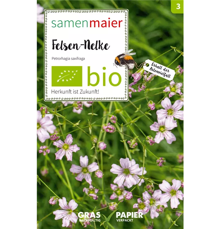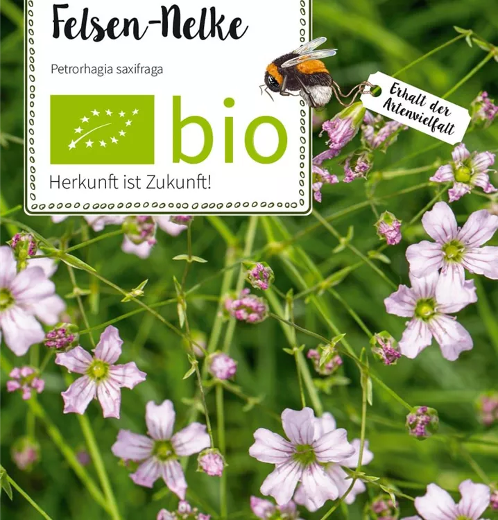 Die Felsen-Nelke ist eine ausdauernde Pflanze mit blassrosa Blüten. Sehr gut für Trockenmauern, Gründächer und Blumenkisten geeignet. Tipp: Es empfiehlt sich eine Anzucht im Topf.