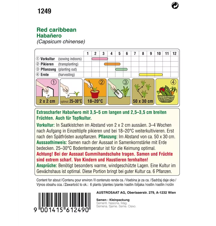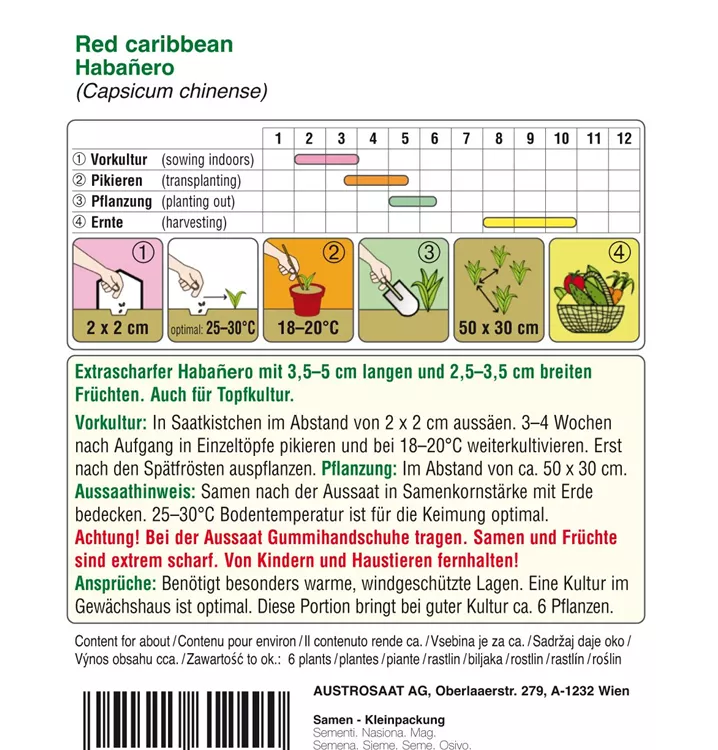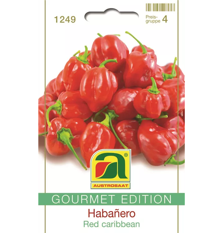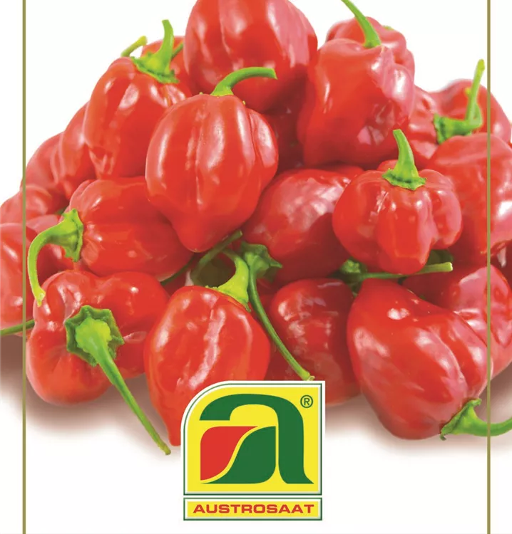 Extrascharfer Habanero mit 3,5-5 cm langen und 2,5-3,5 cm breiten Früchten. Auch für Topfkultur.