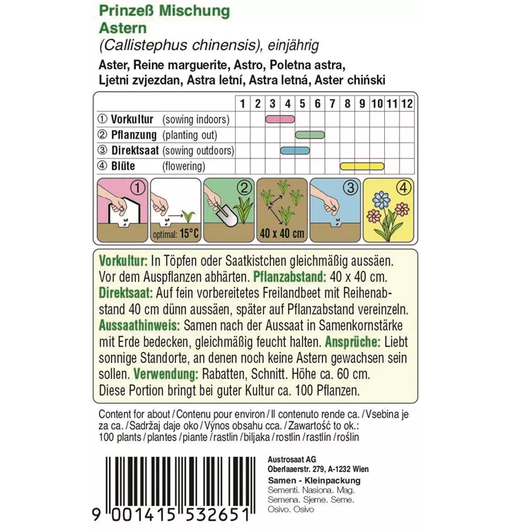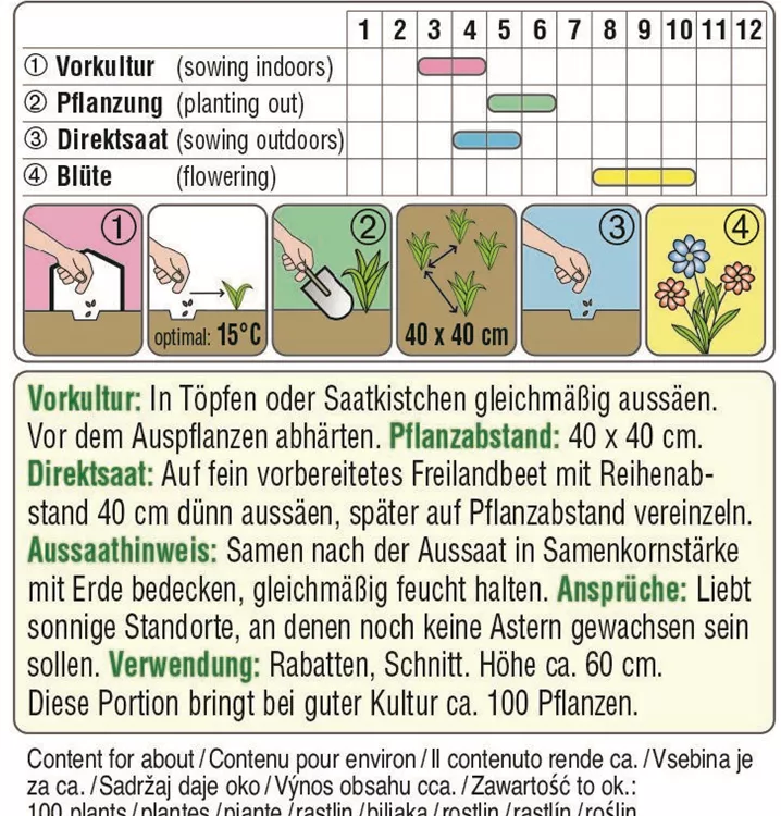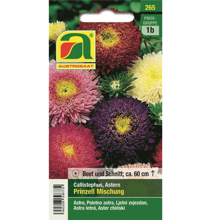 Eine schöne Mischung mit gut gefüllten Blüten. Astern gehören zu den traditionellen Pflanzen eines Bauerngartens und lieben sonnige Standorte, an denen noch keine Astern gewachsen sein sollen. Sie kann für die Bepflanzung von Rabatten und für den Schnitt verwendet werden.