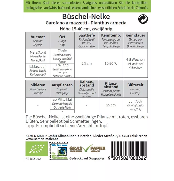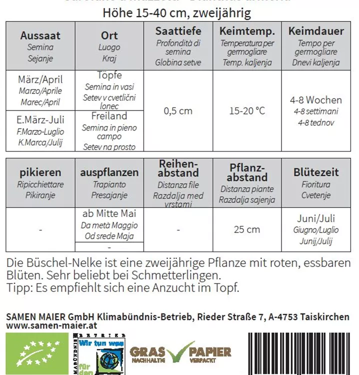 Die Büschel-Nelke ist eine zweijährige Pflanze mit roten, essbaren Blüten. Sehr beliebt bei Schmetterlingen. Tipp: Es empfiehlt sich eine Anzucht im Topf.