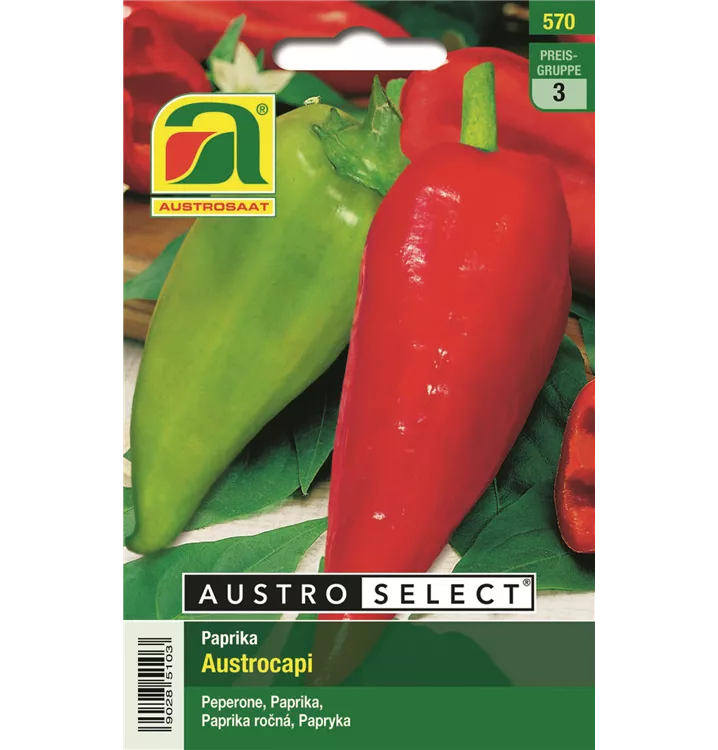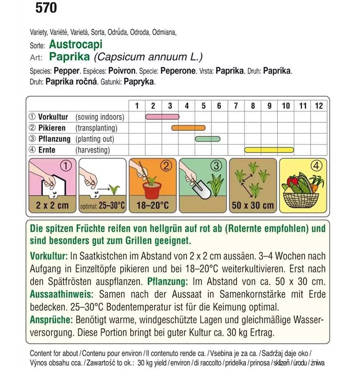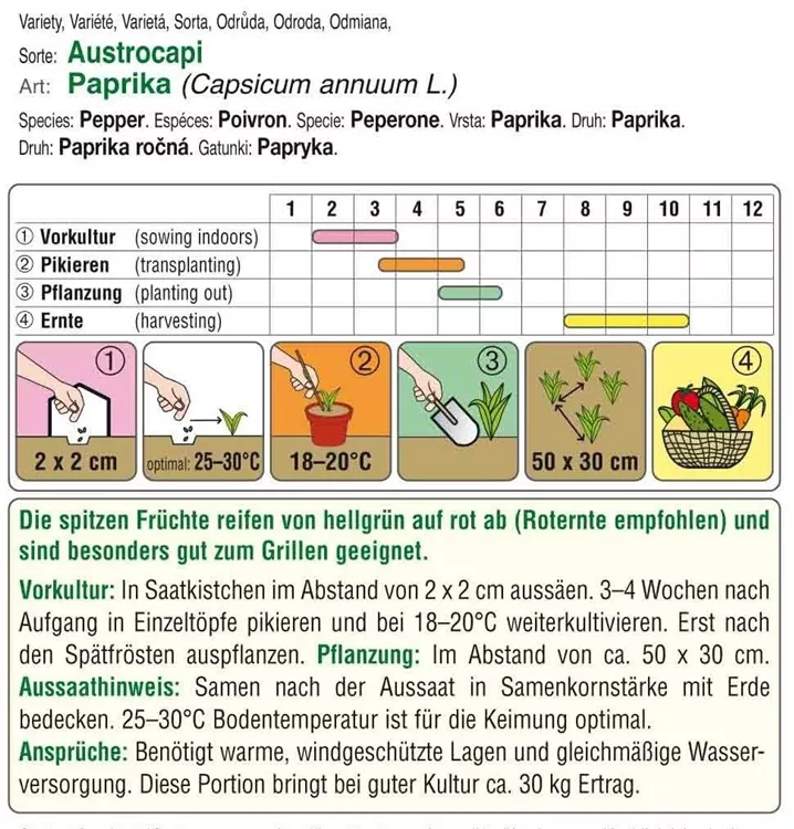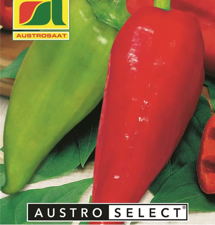 Die spitzen Früchte reifen von hellgrün auf rot ab (Roternte empfohlen) und sind besonders gut zum Grillen geeignet.