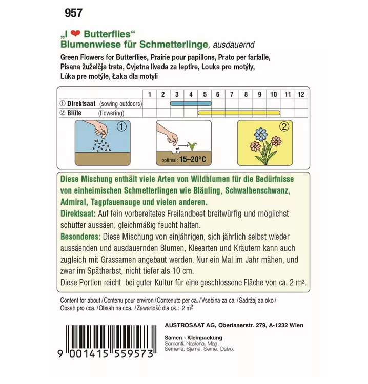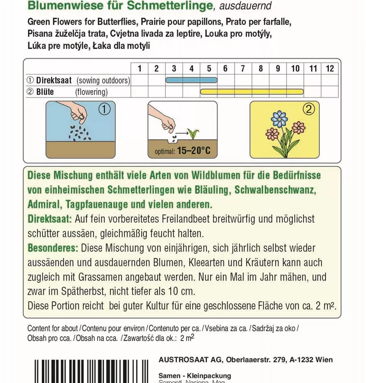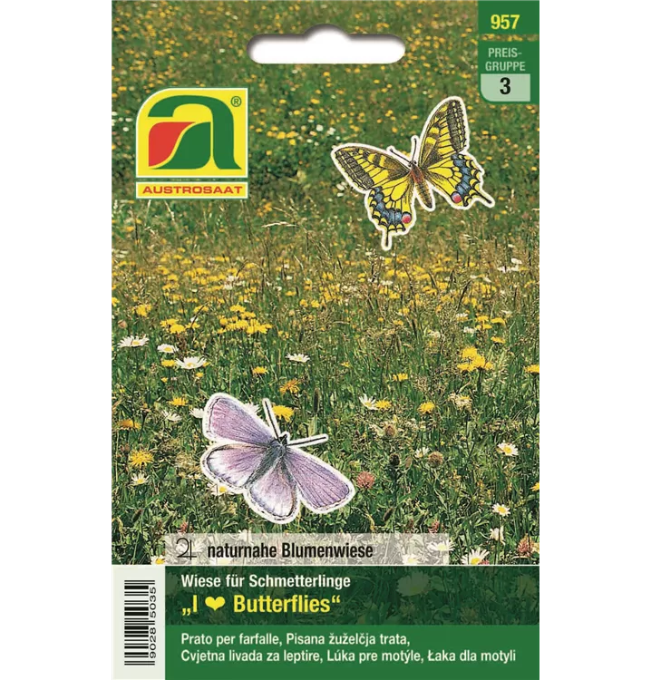 Diese Mischung enthält viele Arten von Wildblumen für die Bedürfnisse von einheimischen Schmetterlingen wie Bläuling, Schwalbenschwanz, Admiral, Tagpfauenauge und vielen anderen.