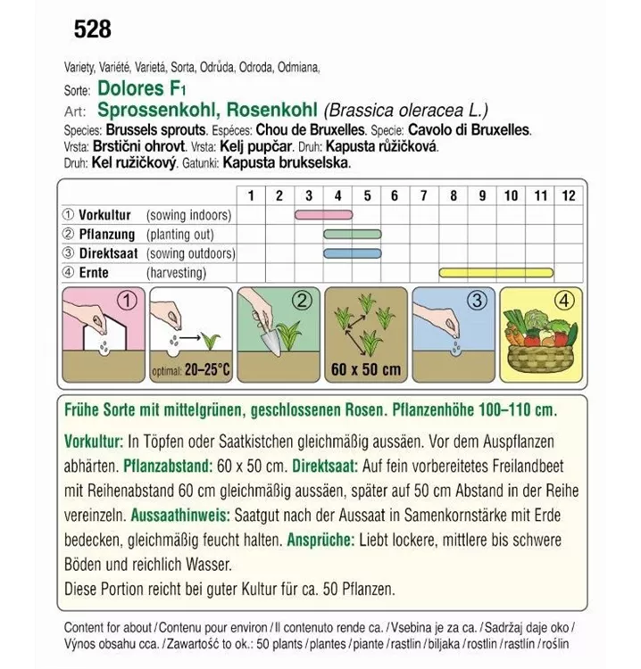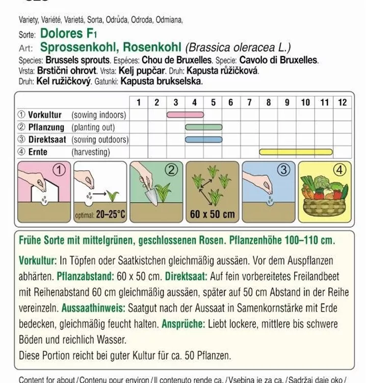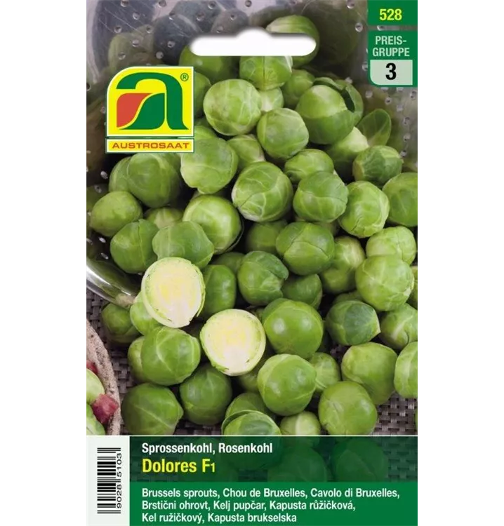 SprossenkohlDolores F1 ist eine frühe Sorte und bildetmittelgrüne, geschlosseneRosen.Er bevorzugt lockere, mittlere bis schwere Böden und verlangt regelmäßige Versorgung mit Wasser.