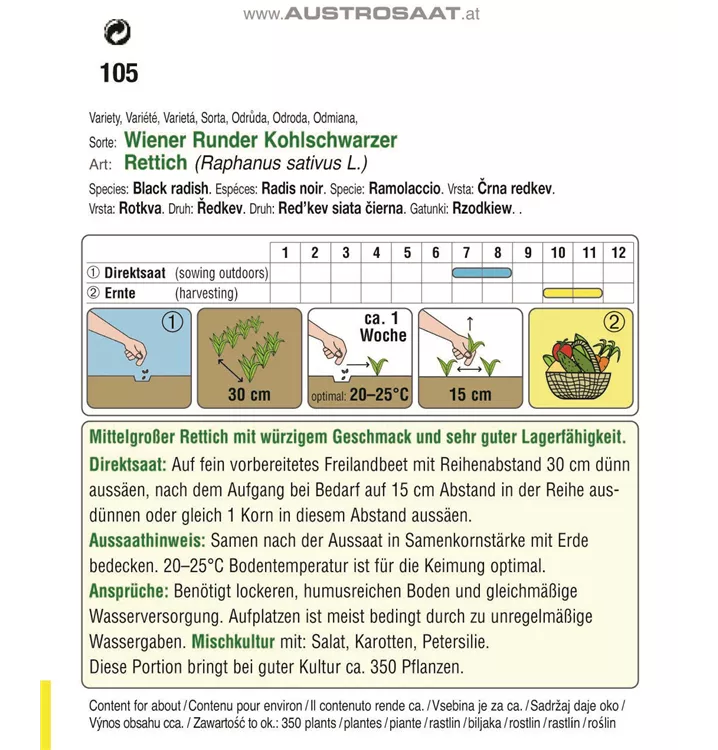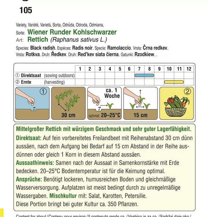 Mittelgroßer Rettich mit würzigem Geschmack und sehr guter Lagerfähigkeit.