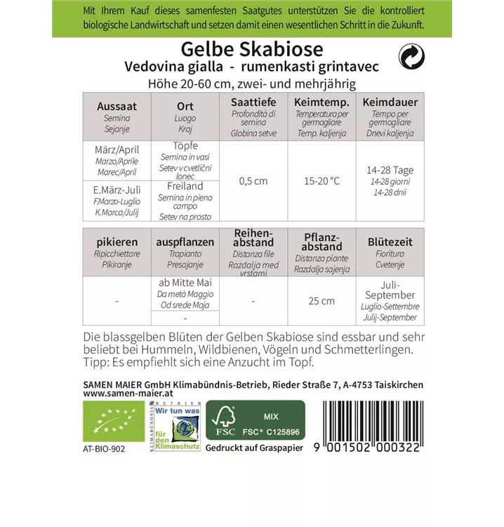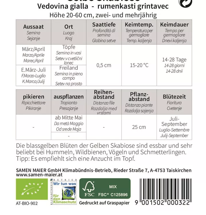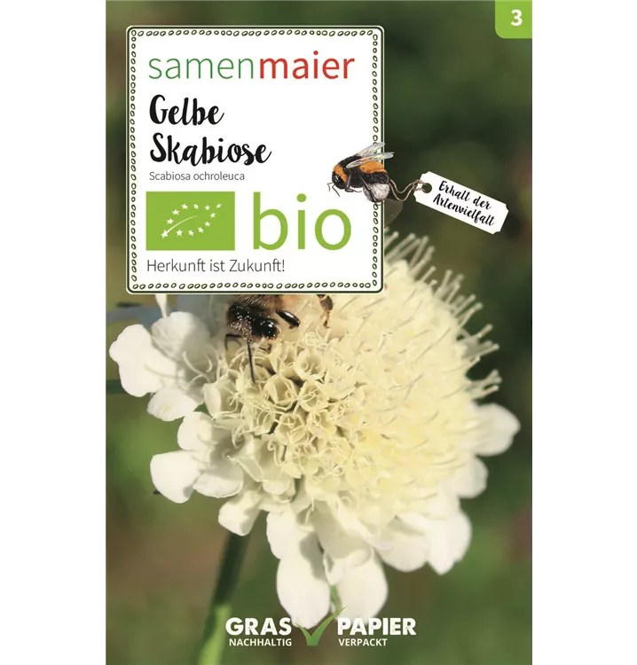 Die blassgelben Blüten der Gelben Skabiose sind essbar und sehr beliebt bei Hummeln, Wildbienen, Vögeln und Schmetterlingen. Tipp: Es empfiehlt sich eine Anzucht im Topf.