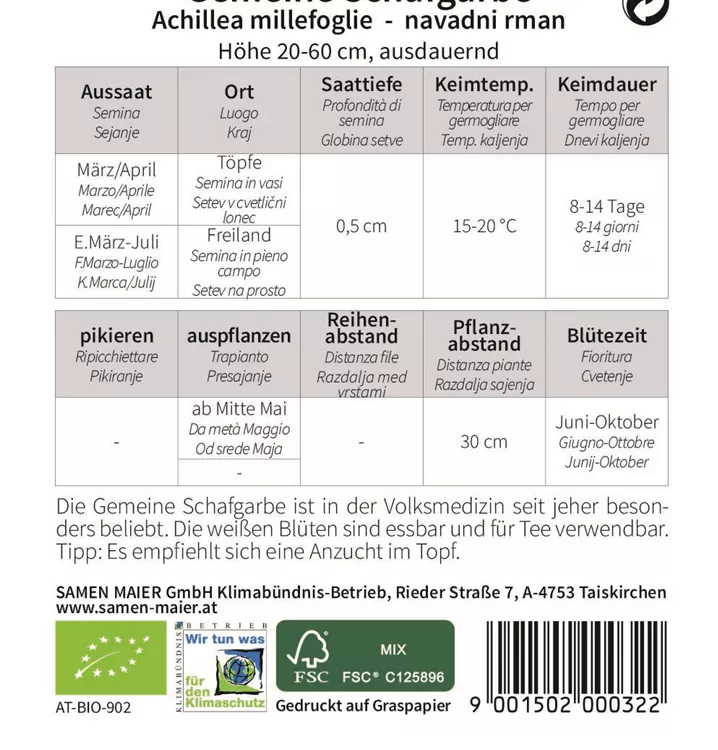 Die Gemeine Schafgarbe ist in der Volksmedizin seit jeher besonders beliebt. Die weißen Blüten sind essbar und für Tee verwendbar. Tipp: Es empfiehlt sich eine Anzucht im Topf.