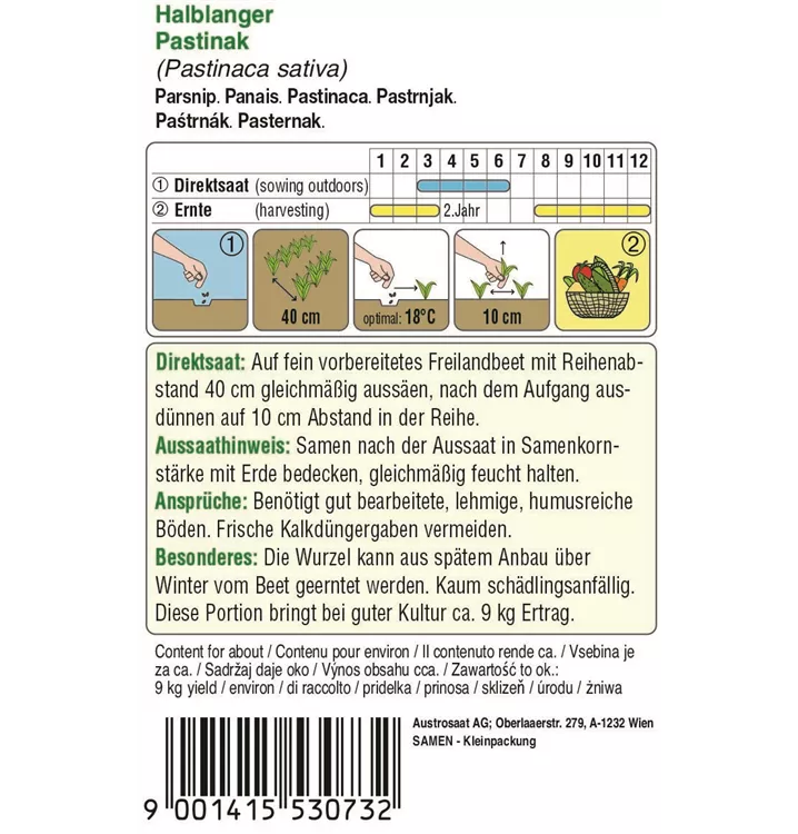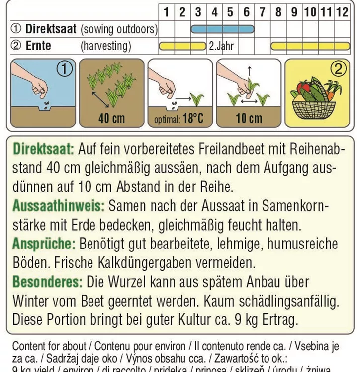 Pastinak Halblanger hat halblange, gut geformte Wurzeln. Pastinak benötigt gut bearbeitete, lehmige, humusreiche Böden. Bei spätem Anbau kann den ganzen Winter über geerntet werden.