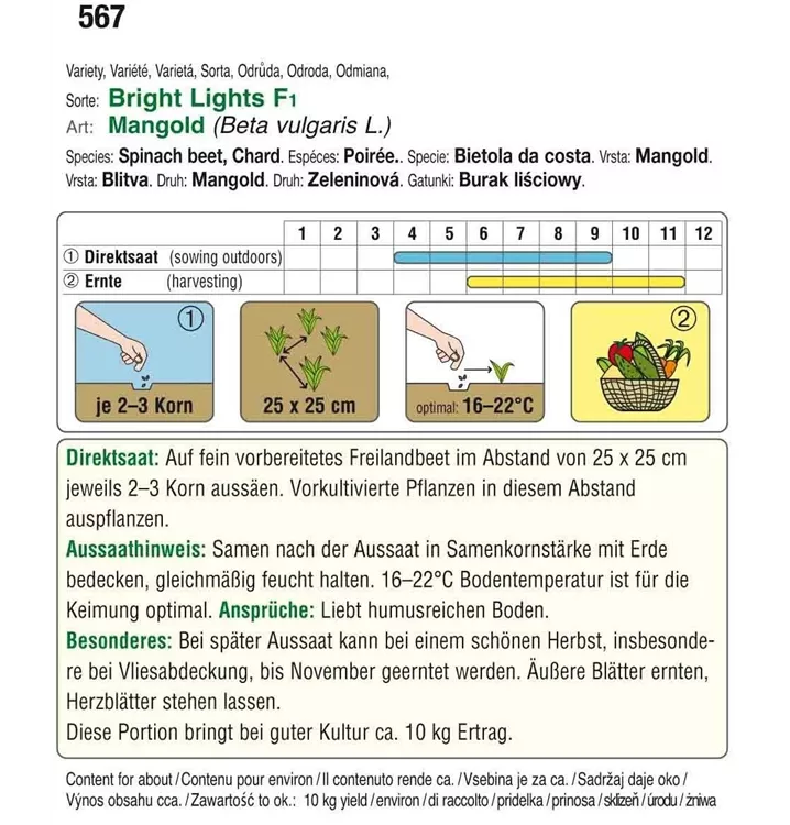 Ein gewellter Stielmangold mit grün bis bronzefarbenen Blättern und hat durch seine bunten Stiele in den Farben Gold, Rosa,Orange, Purpur, Rot und Weiß auch einen hohen Zierwert. Je kühler die Temperatur, desto intensiver färben sich die Stiele. Bei später Aussaat kann bei optimalen Witterungsbedingungen bis November geerntet werden.
